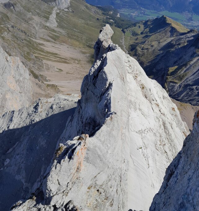 Pointe Percée (2750m): Arête du doigt 4c (4b obl.), Ausstieg 5c+ AO