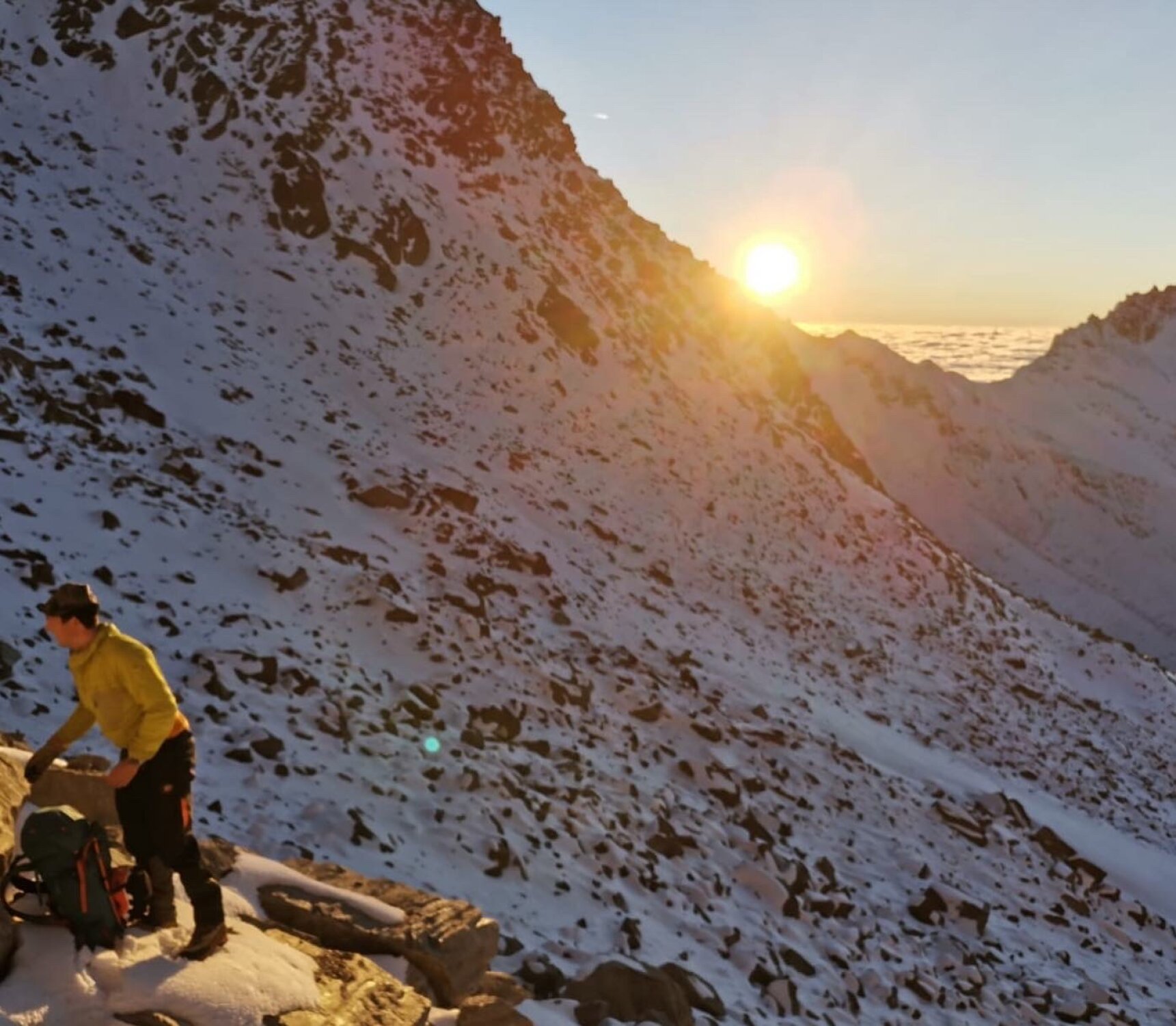 Schnee oben drin gut zu überwältigen, teilweise Trittfirn, manchmal leicht wind gepressten Neuschnee aber nie mehr als 30 cm. Obendrin einige wenige Spalten.