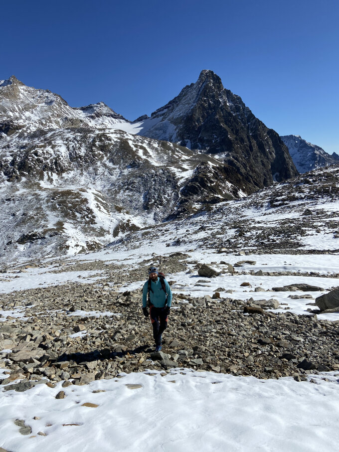 Ab ca. 2'700 m liegt auf der italienischen (West-) Seite viel Schnee. Man kann aber gut auf den Steinen und Felsblöcken "surfen", ohne dass man in den Schnee einsackt.