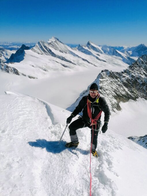 Gut machbar ab Jungfraujoch. Ab Einstieg knapp 2,5 h rauf. Waren wegen Zugverspätung in Bern erst auf der zweiten Bahn hinauf dafür letztendlich alleine am Gipfel. Von den 6 Seilschaften hatten 2 wegen des starken Windes in der Mitte umgekehrt, die anderen 3 (BF) waren schon im Abstieg. Perfektes Timing - der Mönch für uns allein. Ideale Verhältnisse bis auf den starken Wind, welcher aber im Abstieg eher nachliess.