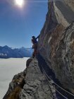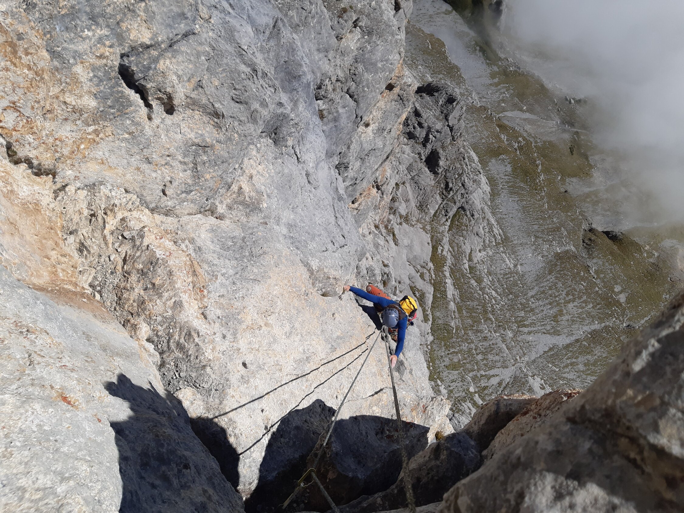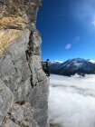 SL3: Sind eigentlich zwei Seillängen. Der Zwischenstand (Muniring) befindet sich vor einem Quergang. Dieser sollte wegen des Seilzugs nicht ausgelassen werden.