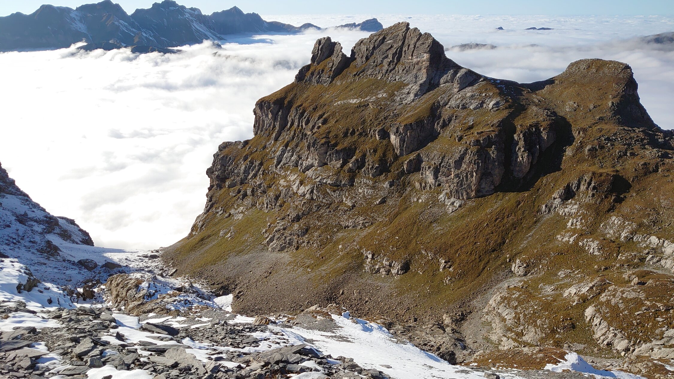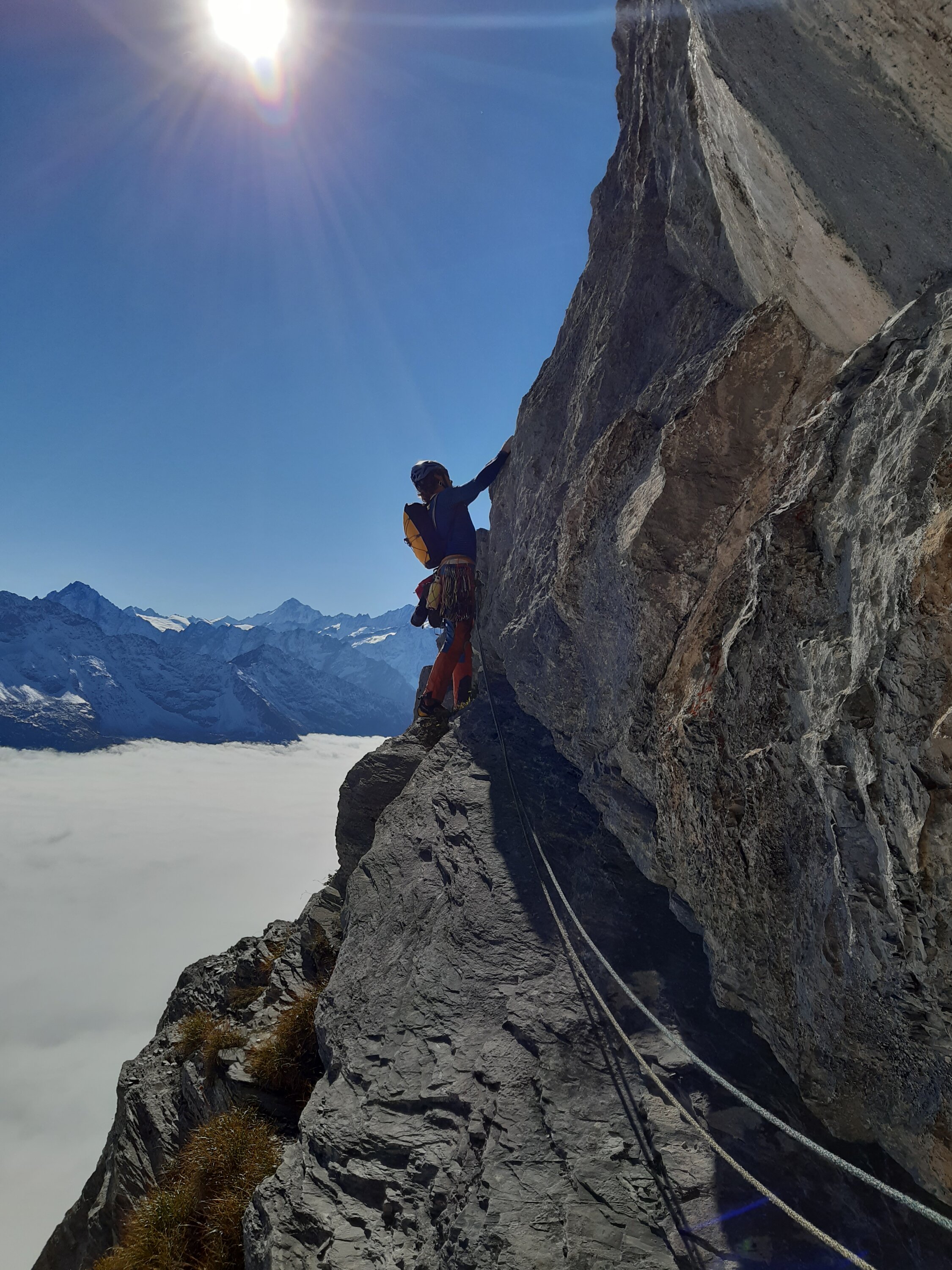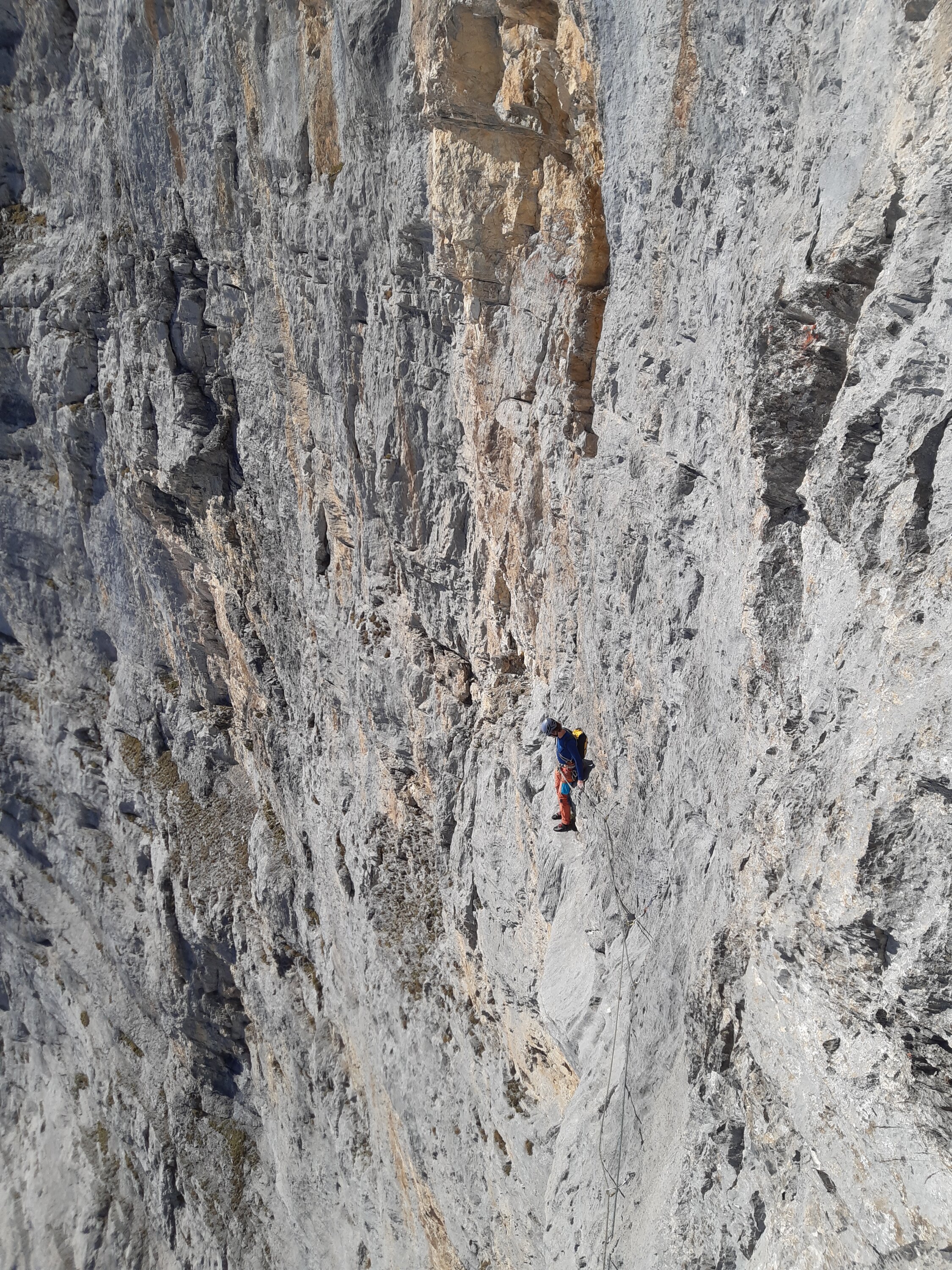Das Topo für den Abstieg über die Naht ist ebenfalls nicht wirklich brauchbar. Der Abstieg beginnt beim grossen Steinmann, ca. 600 m östlich des Routenausstiegs (nicht 450 m). An den ersten paar Abseilständen kann man bei trockenen Verhältnissen einfach vorbeilaufen. Danach muss man zweimal 40m abgeseilen und landet auf einem breiten Schutt und Grasband. Folgt man nun der Naht in südwestlicher Richtung, wie es im Filidor extrem eingezeichnet ist, muss man weitere dreimal abseilen. Das möchte man wirklich nicht abklettern! Im SAC Führer ist allerdings eingezeichnet, dass man nach rechts, also in südöstlicher Richtung, auf den Wanderweg kommt. Dies haben wir nicht ausprobiert, weil ich das erst danach gesehen habe.