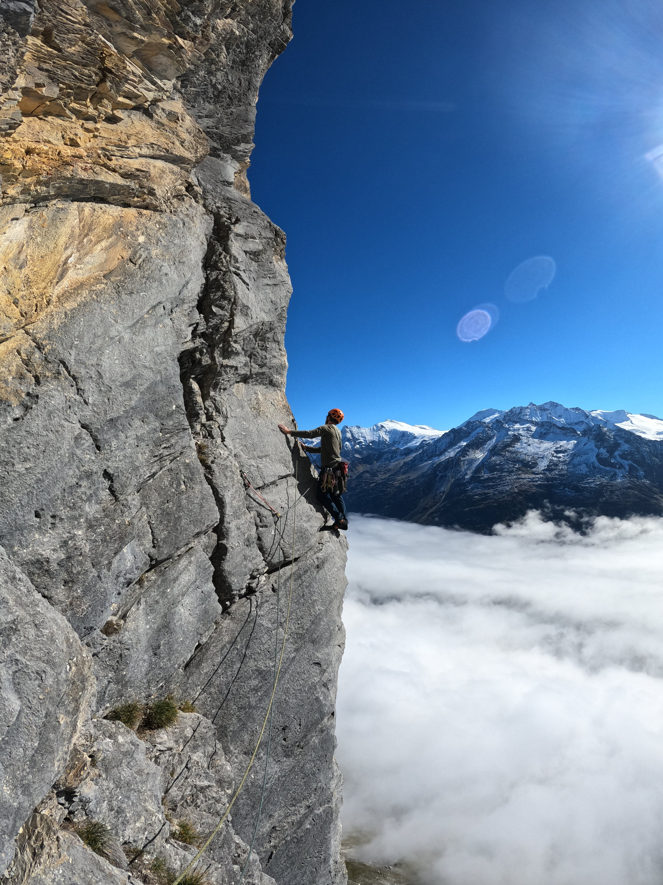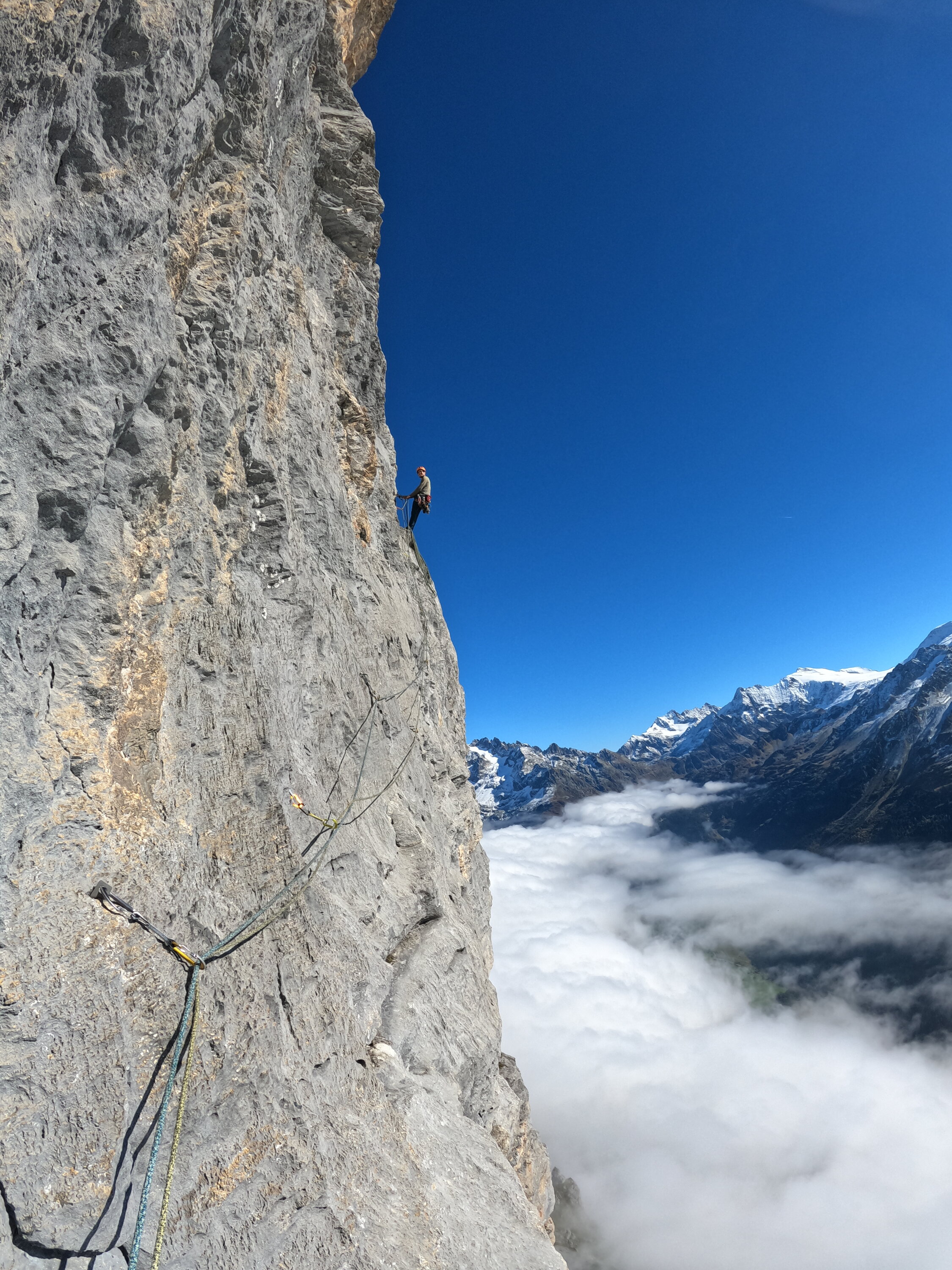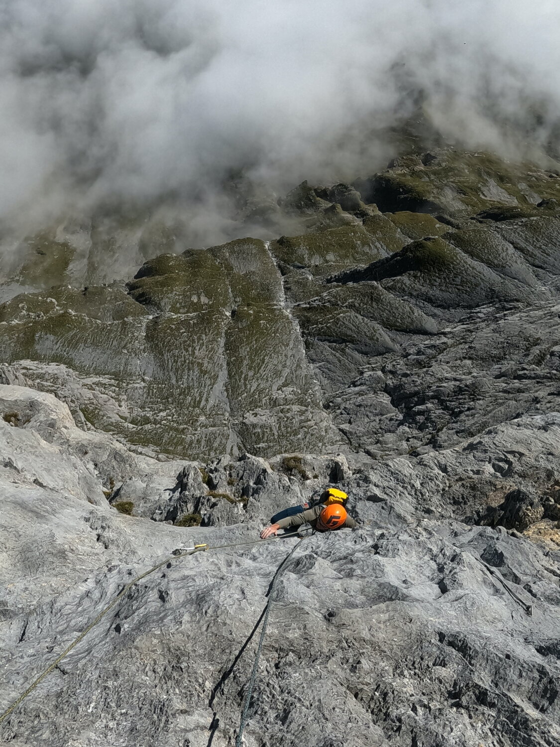 Das Topo für den Abstieg über die Naht ist ebenfalls nicht wirklich brauchbar. Der Abstieg beginnt beim grossen Steinmann, ca. 600 m östlich des Routenausstiegs (nicht 450 m). An den ersten paar Abseilständen kann man bei trockenen Verhältnissen einfach vorbeilaufen. Danach muss man zweimal 40m abgeseilen und landet auf einem breiten Schutt und Grasband. Folgt man nun der Naht in südwestlicher Richtung, wie es im Filidor extrem eingezeichnet ist, muss man weitere dreimal abseilen. Das möchte man wirklich nicht abklettern! Im SAC Führer ist allerdings eingezeichnet, dass man nach rechts, also in südöstlicher Richtung, auf den Wanderweg kommt. Dies haben wir nicht ausprobiert, weil ich das erst danach gesehen habe.
