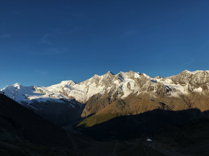 Nicht allzu viel Schnee, oben guter Firn. Steigeisen/Pickel ab 3600m, darunter ohne (Schnee in den schattigen Stellen, bleibt gefroren) Nullgradgrenze auf über 3000m. Ein wenig Wind, im Windschatten sehr angenehm. Weissmieshütte geschlossen, erste Gondel um 8.15 bei Kreuzboden. Mit Schnee mehr als alpine Wanderung.