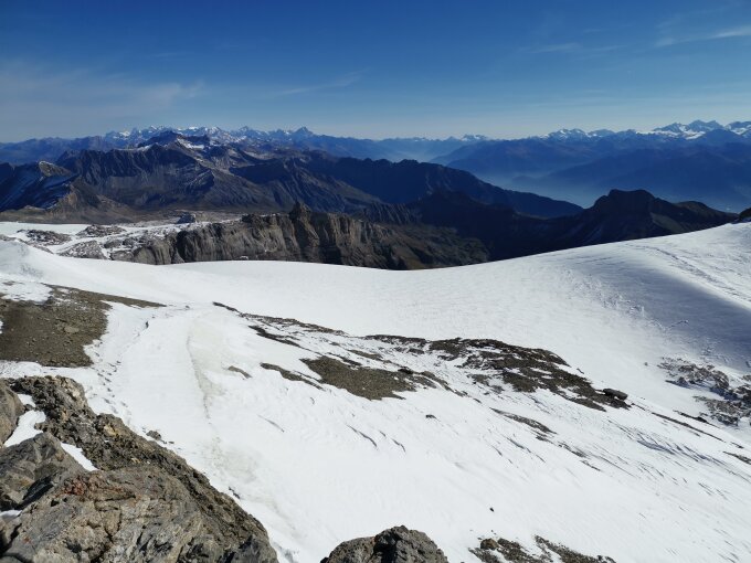 Im Abstieg noch das Oldenhorn drangehängt. Mit Umweg zurück zu den Fahrspuren den Rückweg angesteuert. Ursprünglich wollte ich den Gletscher direkt runterlaufen. Gering überschneite Spalten waren mir dann zu riskant.