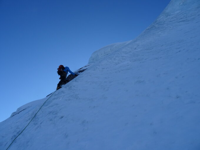 Waren wohl die ersten diese Woche. Daher mühsame Spurarbeit. Gletscher gut begehbar. Man kann direkt auf die Nordwand hin zusteigen ohne Schlenker über Normalweg. Wand unten blank aber sehr gutes Eis und gut mit Schrauben zu sivhern. Mittelteil pulvrig. Danach griffig aber keine Möglichkeit Schrauben zu setzen. Oben raus 10-30cm auf Eisunterlage. Gut zu steigen und gleichzeitig gut zu sichern. Am Grat Pulverschnee. Überschreitung wäre wohl kein Vergnügen. Abstieg anspruchsvoll über ekelig abwärts geschichteten Fels.