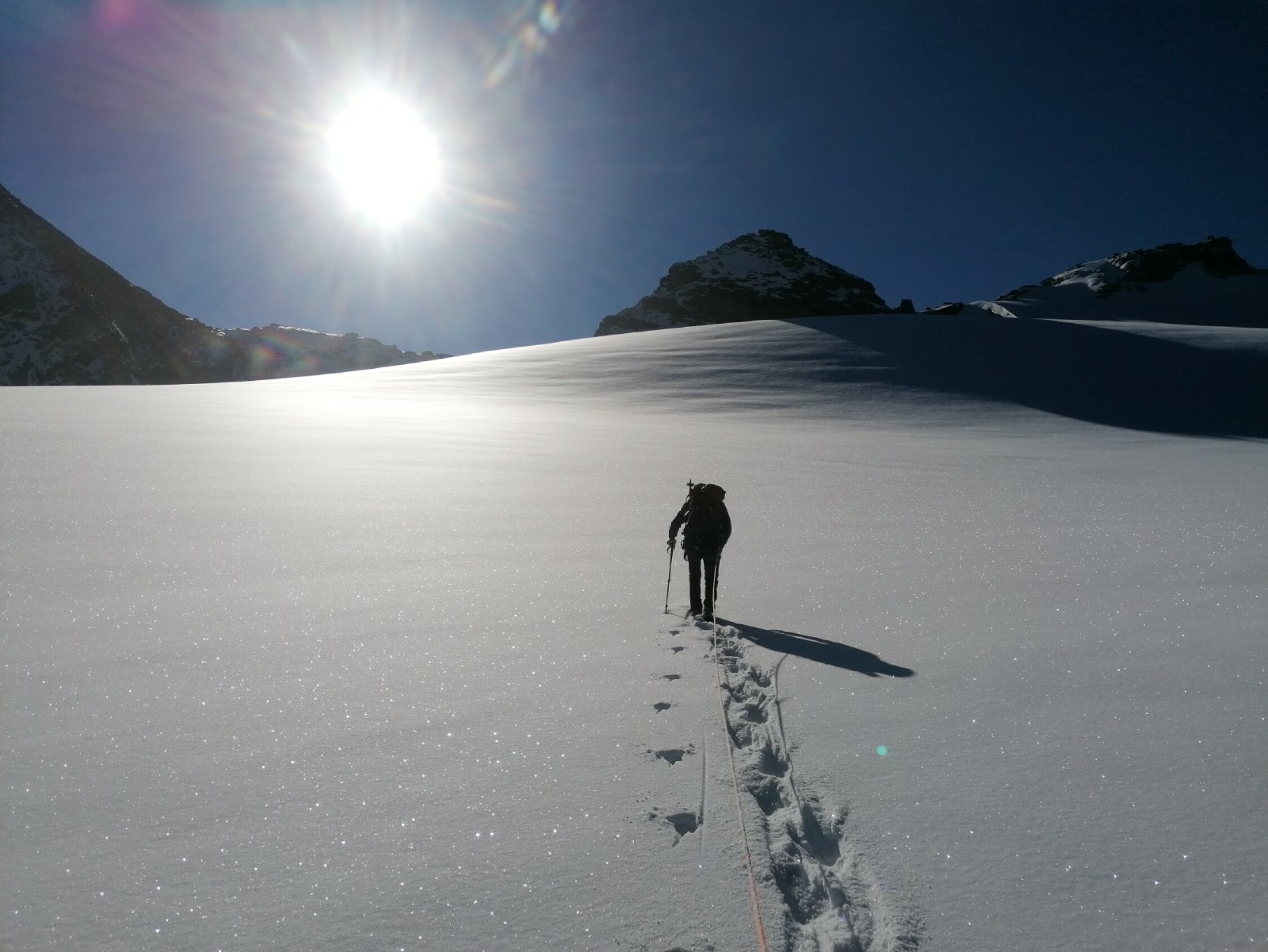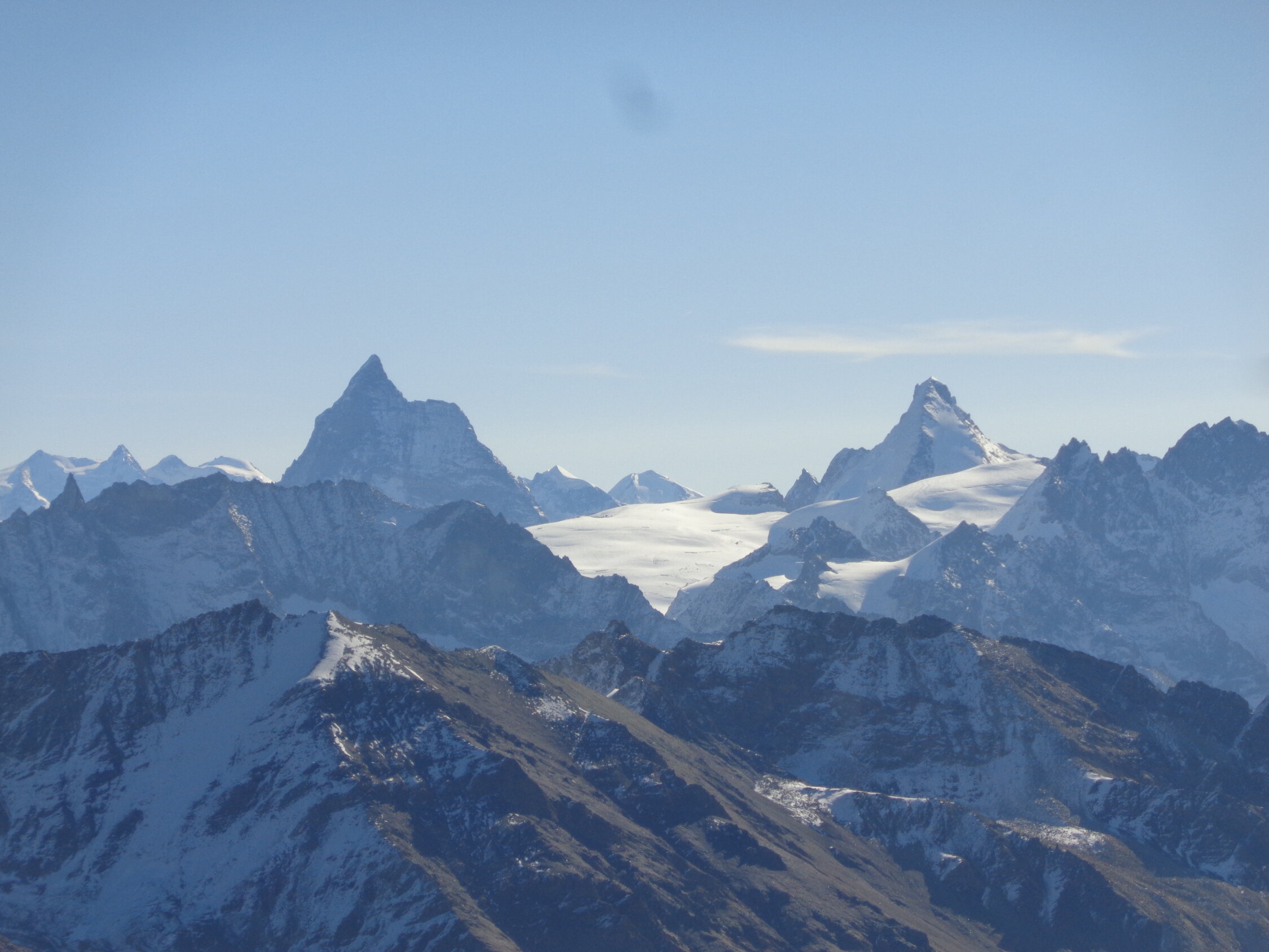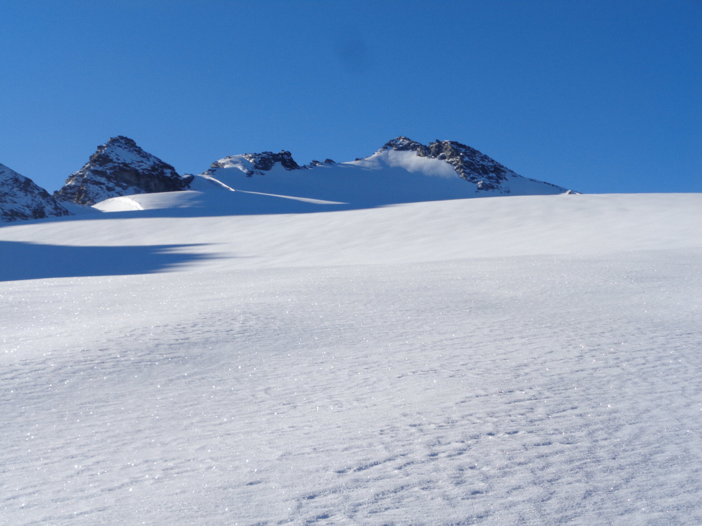 Quizfrage: Auf welchen Berg führt die Sonnen beschienene Gletscherfläche in der Bildmitte? Danke.