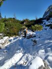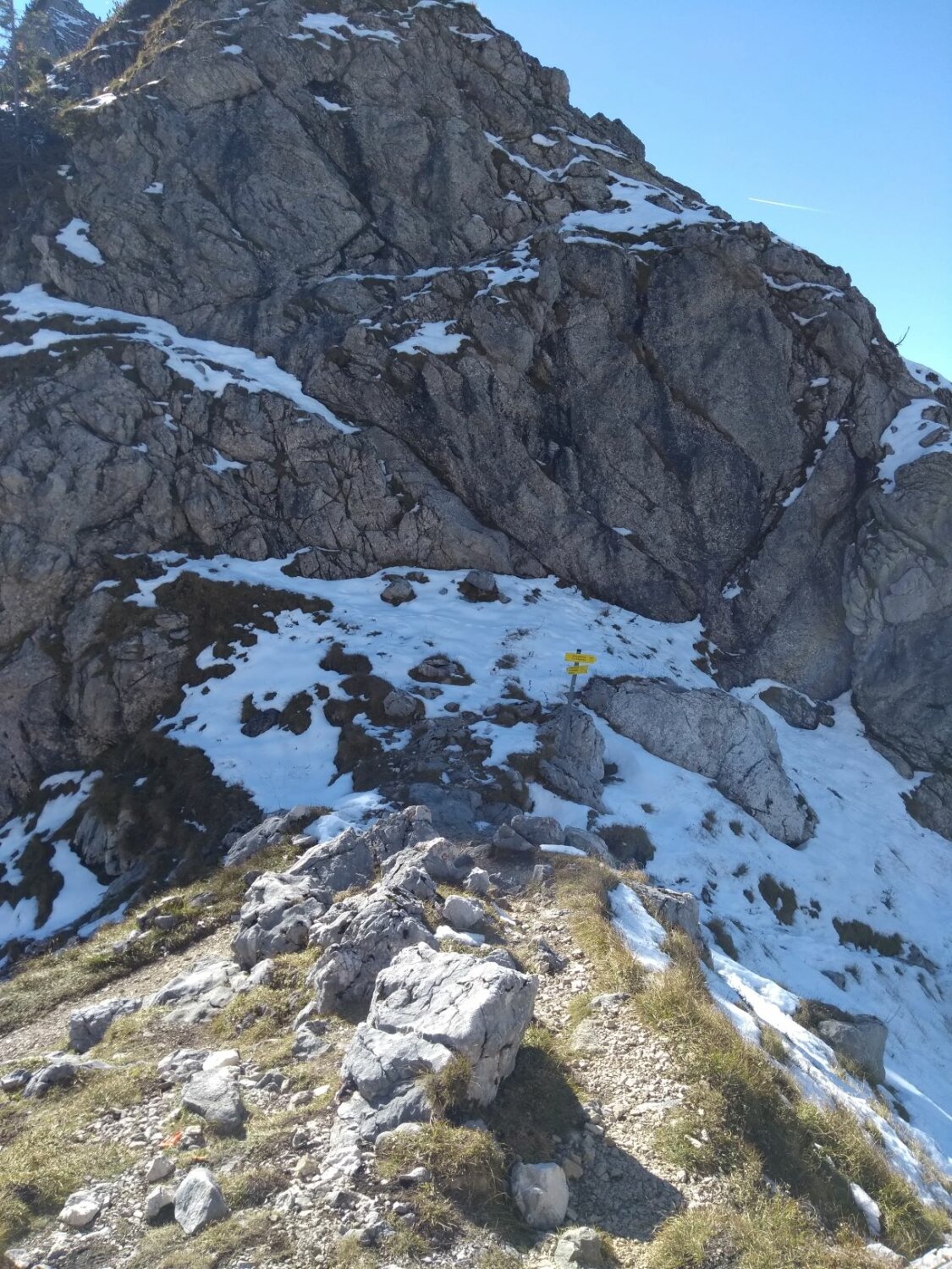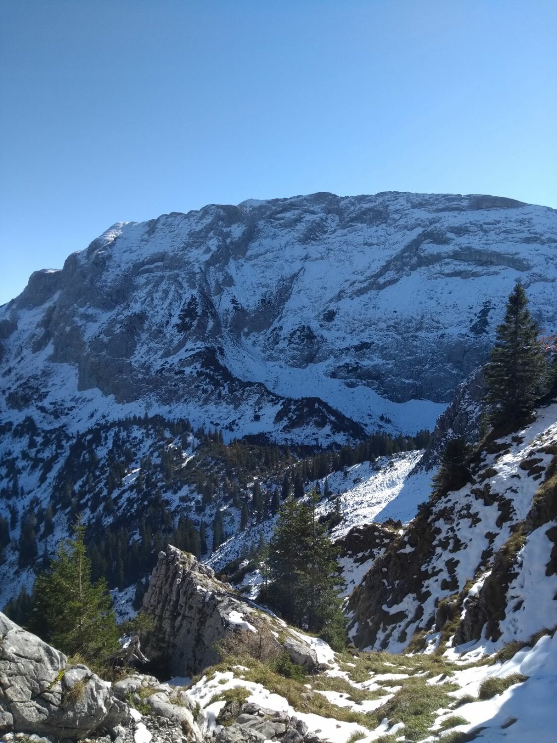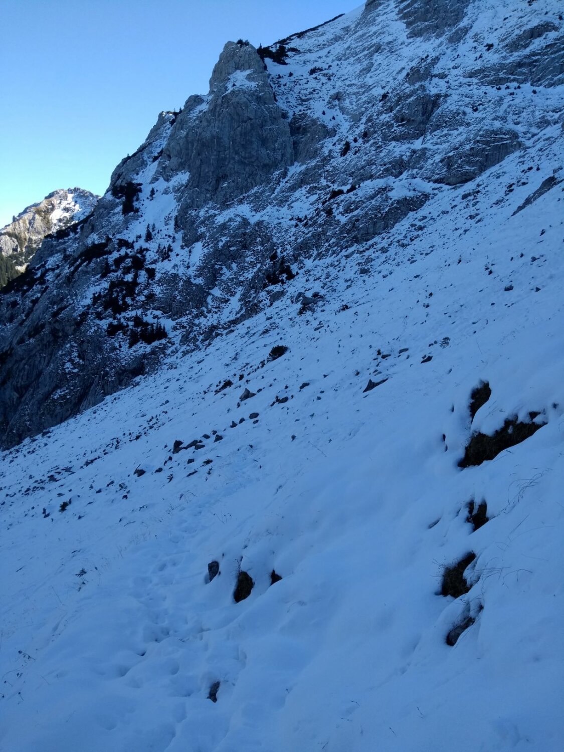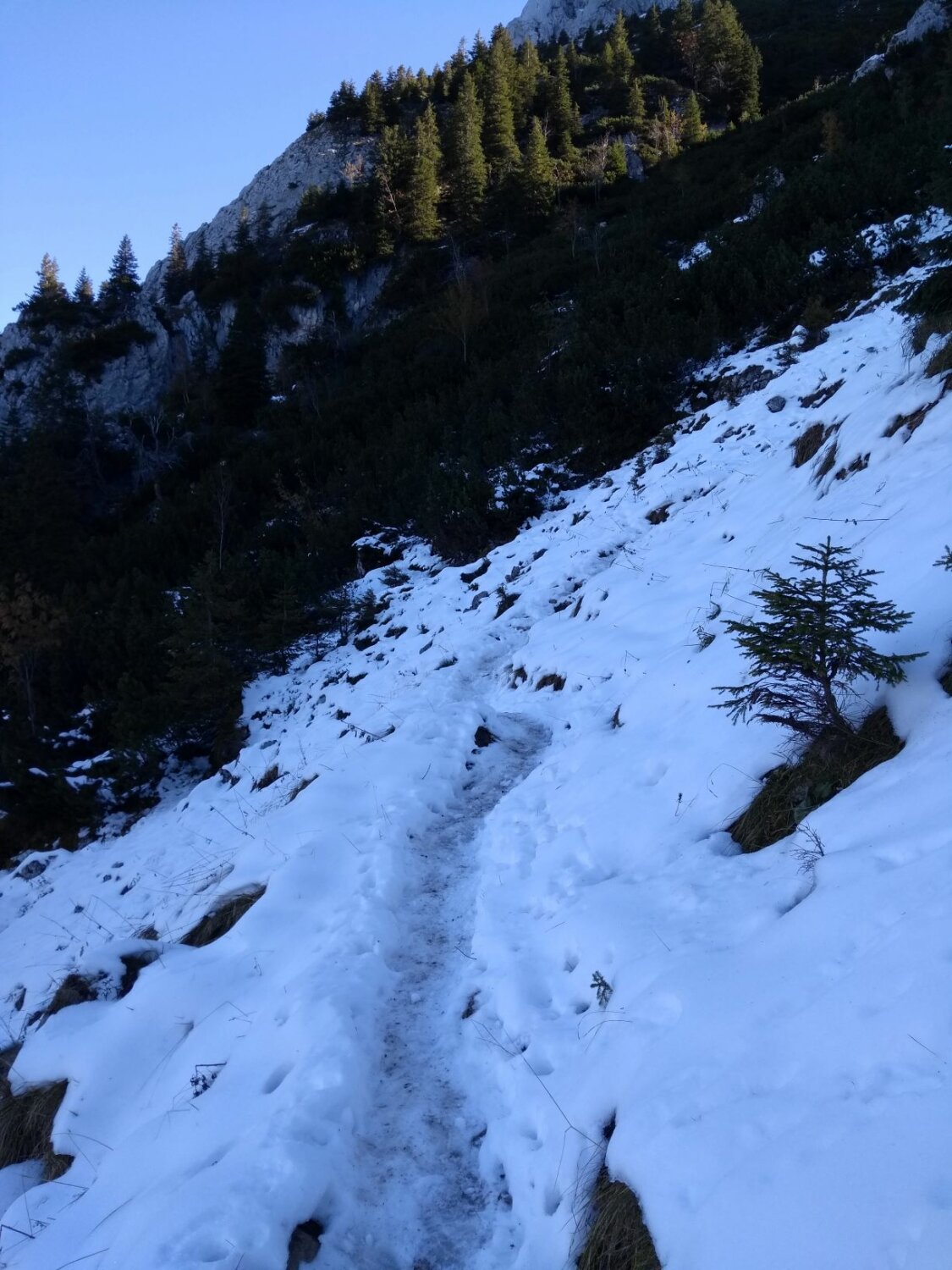 Es hat deutlich mehr Schnee als erwartet. Im Nordanstieg zum Joch, im Gumpenkar, zum Kenzensattel und bis hinunter zum Kenzenbach (ca. 1400m)ist alles schneebedeckt. Spur größtenteils vereist und heikel zu begehen, so dass wir oft ins Gelände ausweichen mussten.