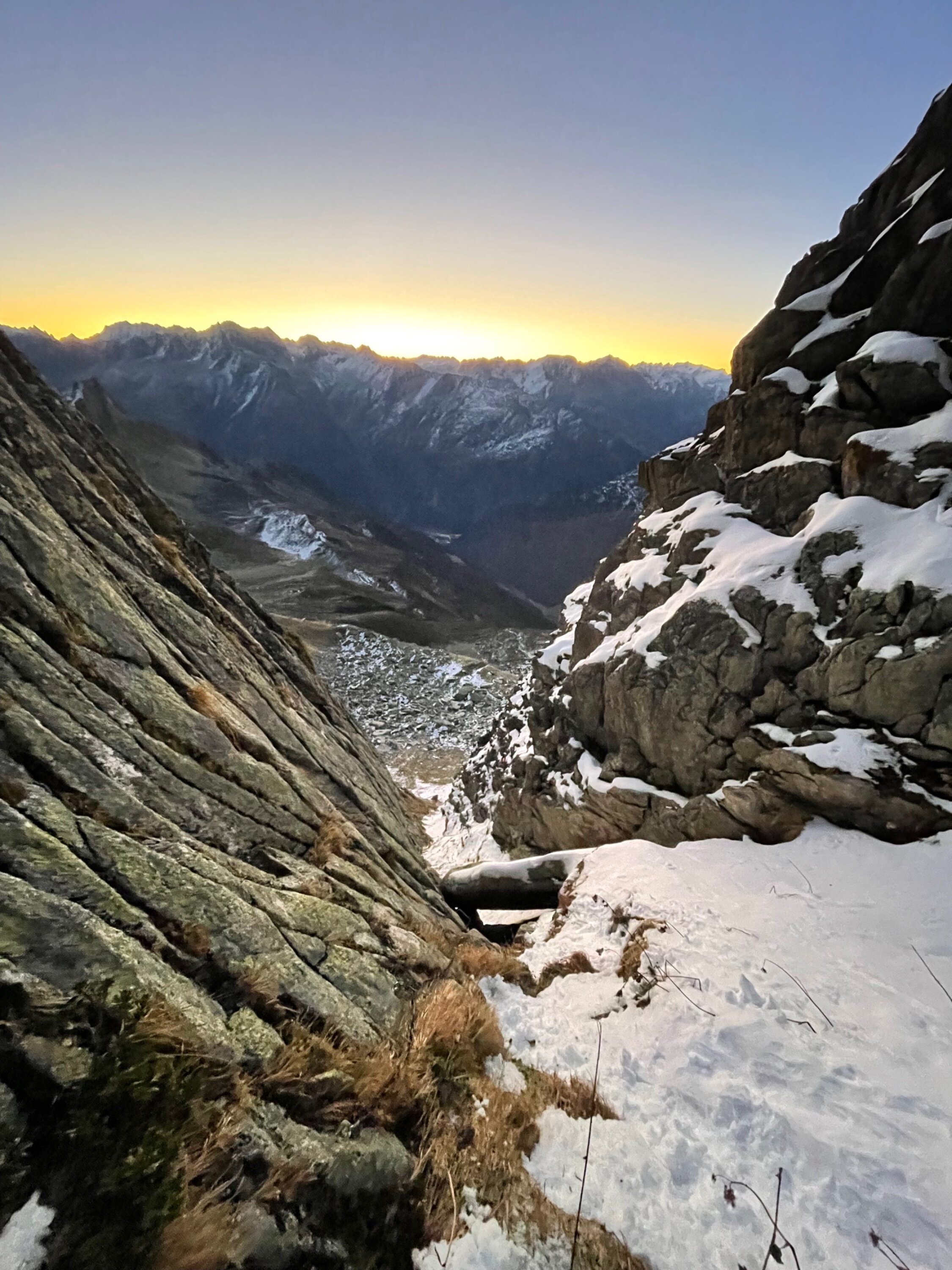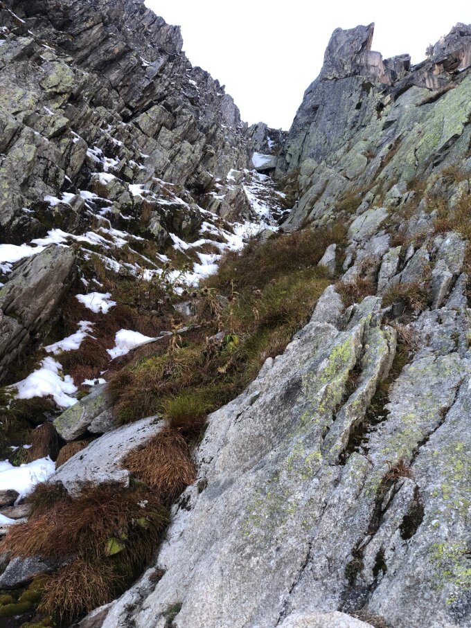 Im Zustieg durch die Rinne liegt Schnee, siehe Foto, allerdings war der Schnee angenehmer zu gehen, als das gefrorene, rutschige Gras. Ggf. bieten sich hier Steigeisen an.