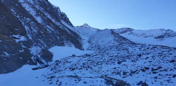 Start der Tour am 8.15 Uhr, bei recht kalten Temperaturen, die Ski mussten entlag der Militärstrasse getragen werden, durch den Bach hoch konnte ich die Ski montieren, dank dem Altschnee, einge Meter wieder ohne Ski queren bis zum Gletscher, da waren die Verhältnisse sehr gut 20- 30 cm Pulverschnee das ich auf den Gipfel verzichtete, noch zweimal den Gletscherteil machte bis zum Bergschrund.