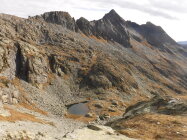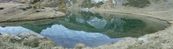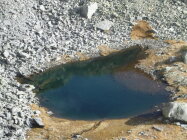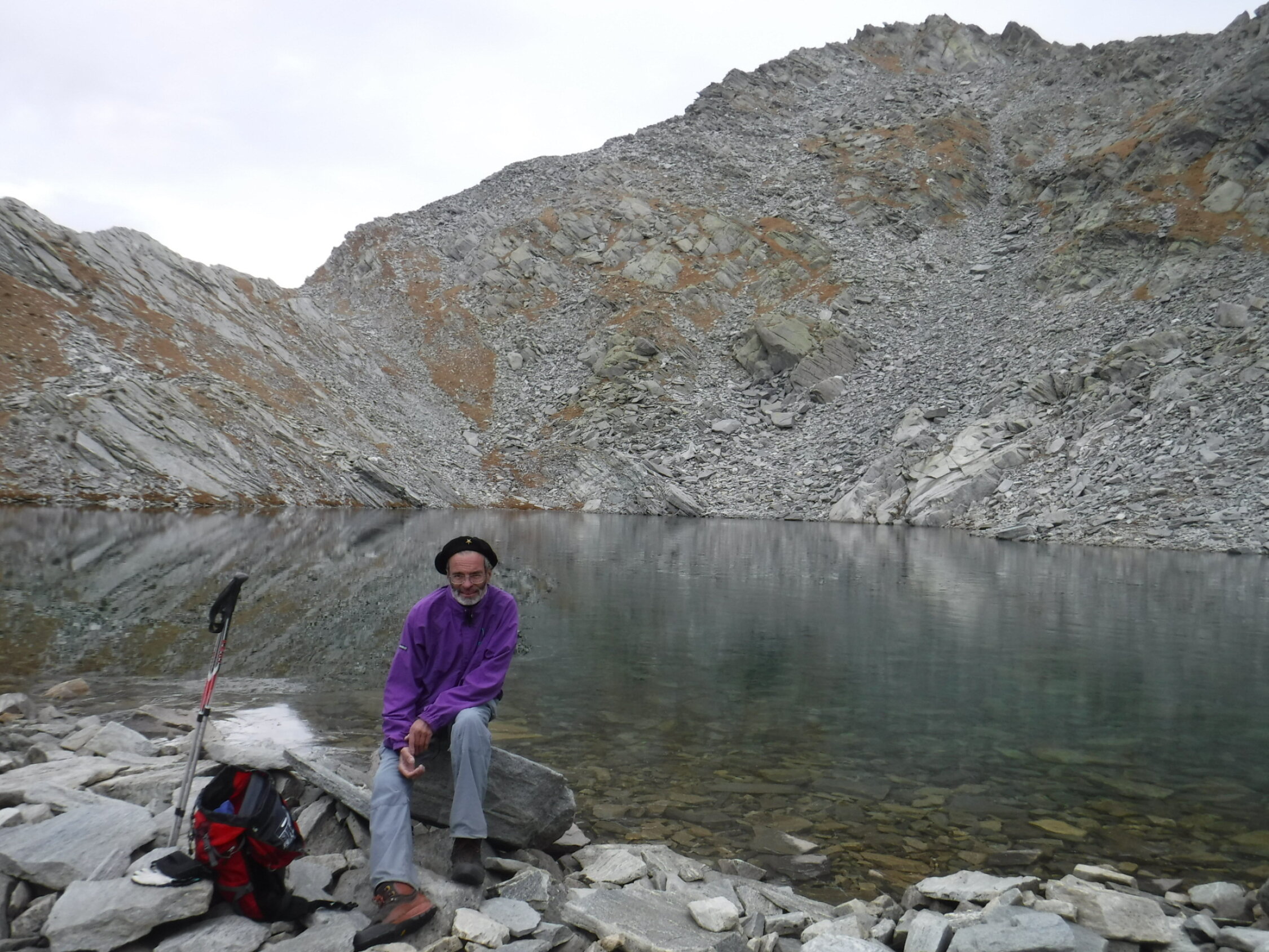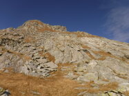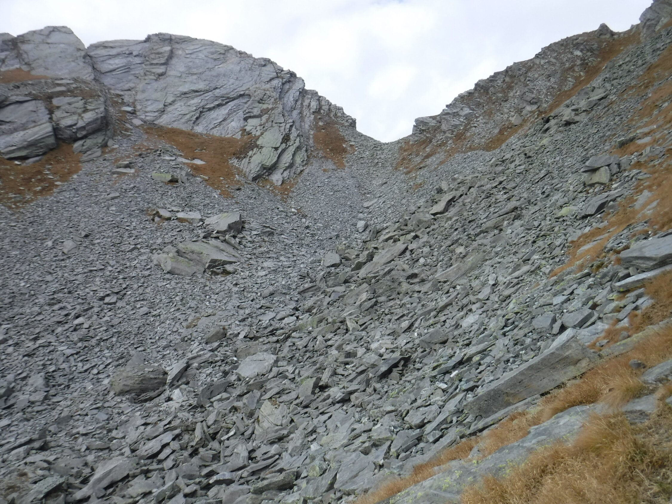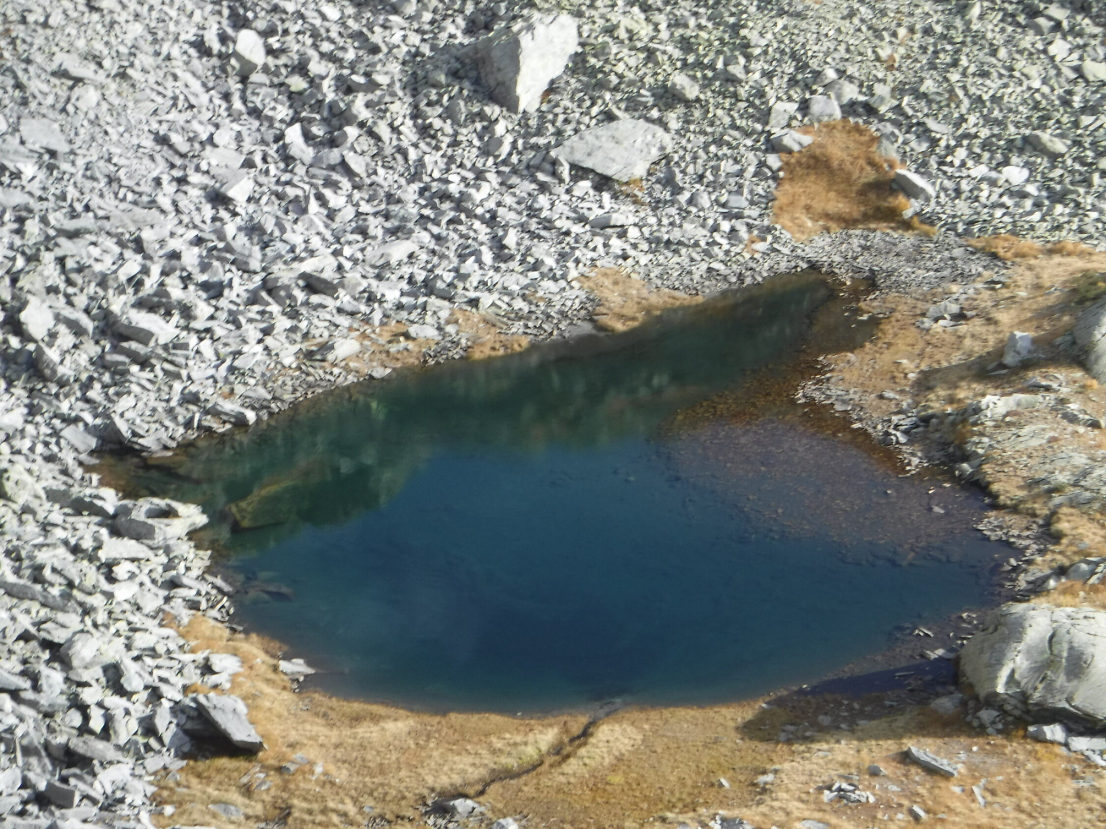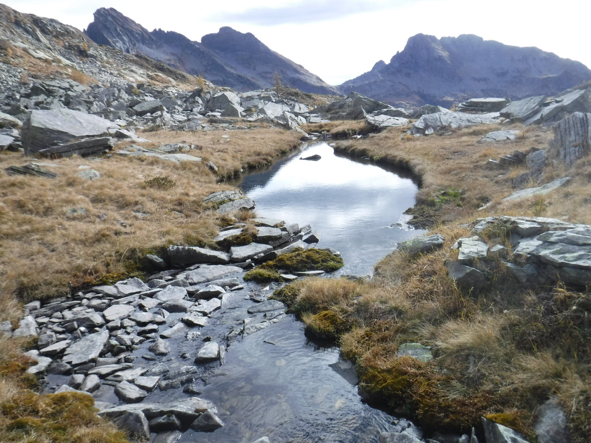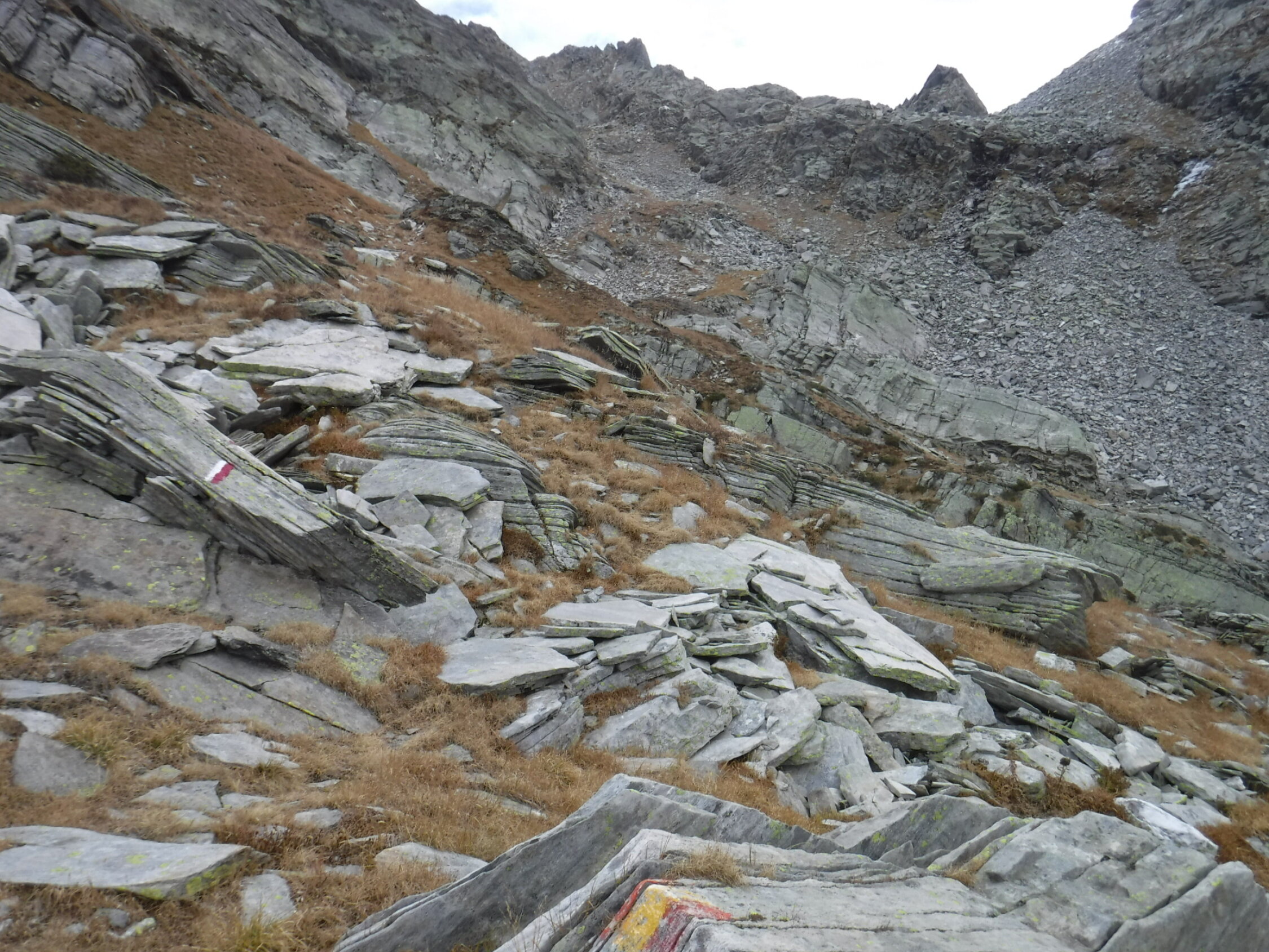 Nach dem Verlassen des Grande Traversata delle Alpi (GTA), bzw. L00 in Richtung Lago Cavegna ostwärts findet man noch einige alte rote Punkte vor sowie Steinmandl, die oberhalb vom Lago Cavegna dann nicht mehr existieren. Das Gelände ist jedoch übersichtlich und die beiden Pässe von Cavegna (Grande und Picolo) nordwestlich, bzw. südöstlich vom Pizzo Porcareccio sind bereits nah und erkennbar. Ich stieg weglos direkt zum Lago Cavegna hinunter und folgte an rechter Seite dem Bach. Dort findet man 2 Steinmänner vor eines ehemaligen Pfades, der in alten Karten zum Teil eingetragen war. Größtenteils ist dieser jedoch verschwunden. Durch Zufall stieß ich dann auf die alten Markierungen vor der 2. Bachschlucht.