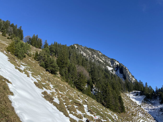 Die Felsflanke ist teils mit Schnee bedeckt, jedoch problemlos machbar. Steigeisen o.ä. sind nicht nötig