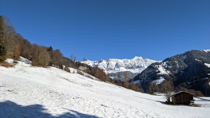 Im Dorf bei der Kirche (P.936) gestartet, zu Fuss bis P.1116, ab da waren die Hänge weiss und Aufstieg mit Ski möglich. Dann über die Normalroute (Guora - Sadreinegg - Ostgrat) zum Gipfel, alles mit Ski machbar.