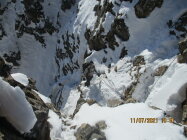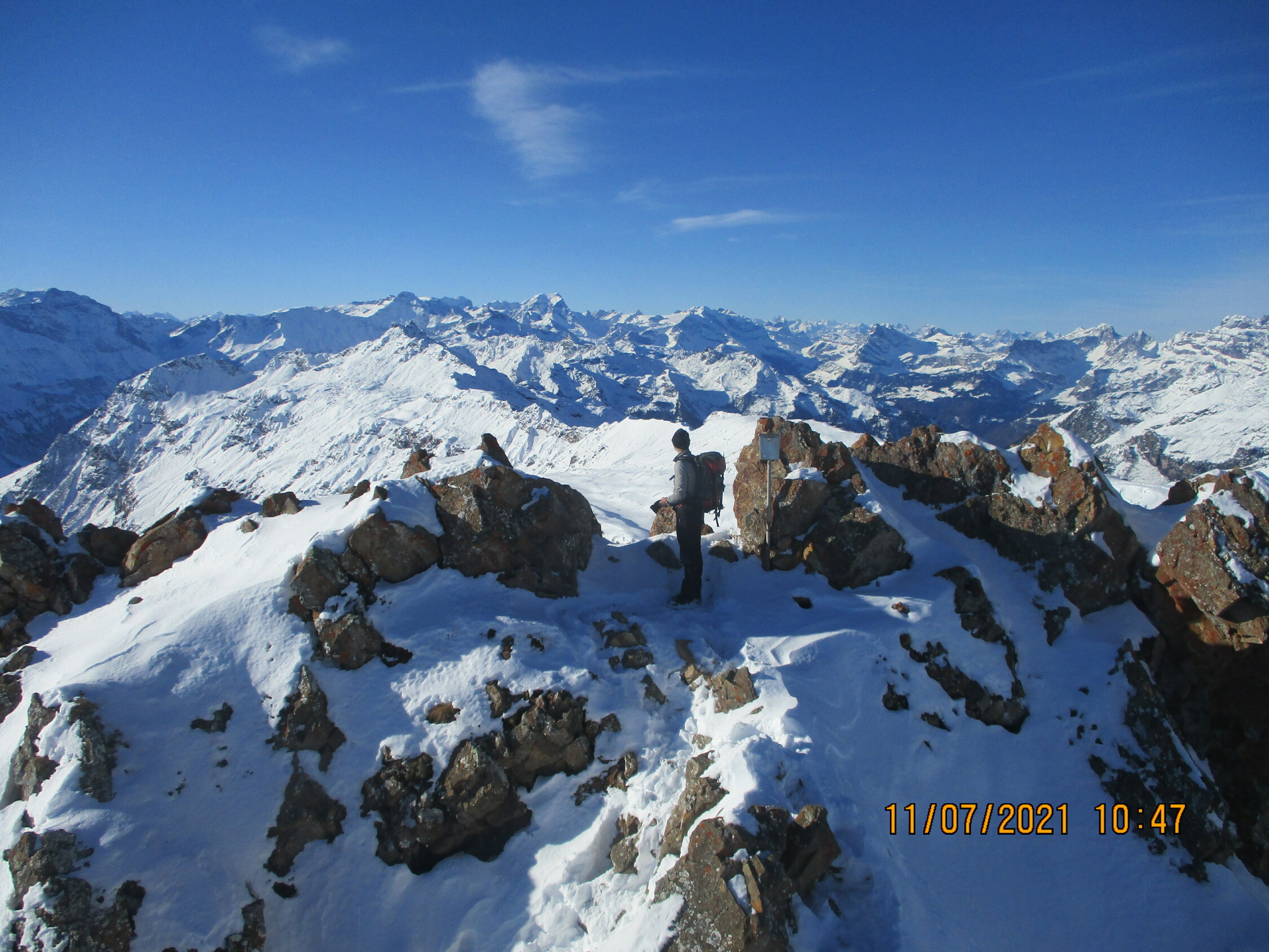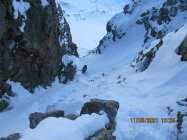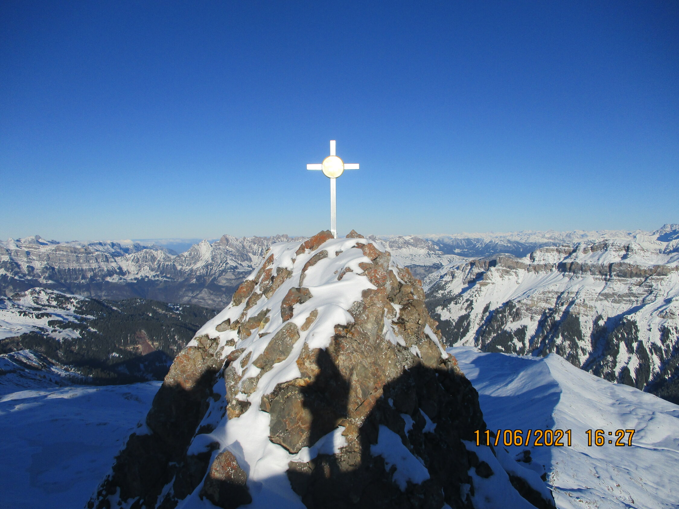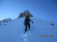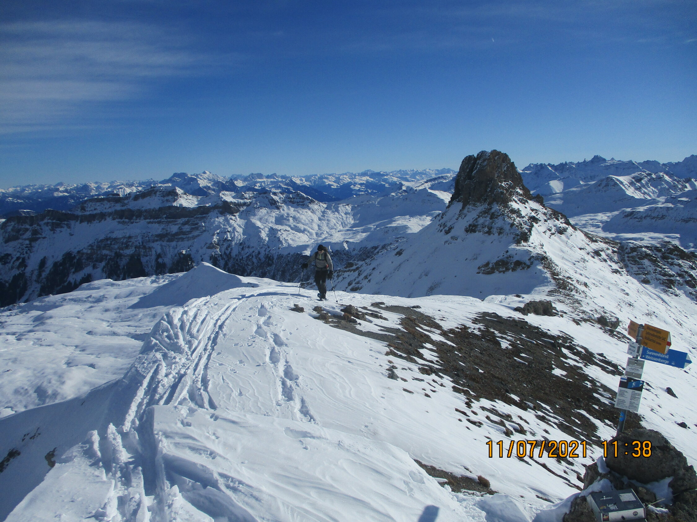 Nach kurzer Rast und Materialdepot im Winterraum der Spitzmeilenhütte weiter via Schönegg bis unters Gipfelcouloir. Recht mühsames Spuren, aber gut machbar. Im Gipfelcouloir lag dicke Schnee, wir versanken mitunter bis zu den Oberschenkeln im dort leicht gedeckelten Pulver. Es gelang uns, sämtliche Ketten wieder unterm Schnee hervorzuziehen und viele Tritte vom Schnee zu befreien. Nach 40 Minuten harter und auch heikler Wühlarbeit standen wir auf dem Vorgipfel mit dem Gipfelbuch. Mit den Gedanken an einen möglicherweise nochmals heiklen Abstieg und wegen der bereits vorgerückten Stunde verzichteten wir auf den kurzen, aber exponierten und mit Schnee garnierten Übergang zum Gipfelkreuz. Zudem hatte ich mit dem Krampfen des Quatrizeps zu kämpfen.
