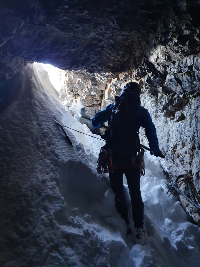 Frühwinterliche Verhältnisse; Aus dem Tunnelfenster IV mussten wir uns rausschaufeln (Schaufel stand dort). Das "steile Schuttfeld" bzw Schneefeld war elendige Spurarbeit bis unterhalb des schwarzen Wulst. Leicht hoch zum Grat. Abseilstand nach etwas Graben gefunden. Wir hatten nur ein 50m Seil mit. Den zweiten Abseilstand haben wir im Schnee nicht gefunden; haben dann von einem großen Klemmblock (- in der Rinne rechts der Falllinie vom ersten Abseilstand wenn man von oben runter guckt -) abgeseilt auf den Klettersteig. Abklettern wäre für uns im unteren Teil keine Alternative gewesen (dann lieber Haken schlagen). Der Klettersteig war ebenfalls ungespurt und quasi komplett eingeschneit. War ebenfalls elendige Spurarbeit im oft hüfthohen Lockerschnee. Wir haben für die 330 Hm alleine 2.5h gebraucht.