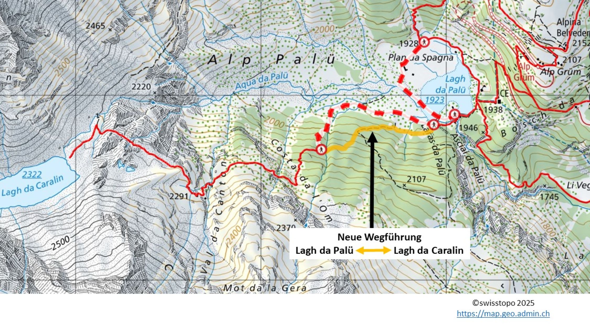 Hinweis: Wegen eines Erdrutsches im August 2023 war der südliche Wanderweg vom Lagh da Palü zum Lagh da Caralin vorübergehend gesperrt. Laut aktueller digitaler Landeskarte (https://map.geo.admin.ch, Optionen "Wanderwege" und "Sperrungen Wanderwege" anklicken; Zugriff 03.08.2025) gibt es eine neue Wegführung. Der neue Weg führt vom SW-Ende des Lagh da Palü unterhalb von Laras da Palü anfangs kurz Richtung SSW im Wald aufwärts, verläuft dann durch zwei Wiesenabschnitte nach W und steigt im weiteren Verlauf wieder im Wald Richtung WSW an, um bei ca. 2055 m in den alten Weg zu münden (s. letzte Kartenskizze in den Bildern).