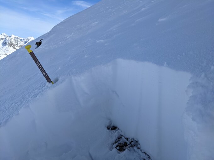 Auf der sonnigen Ostseite im Aufstieg mehr als genug Schnee. In der Nordabfahrt feinster Pulver, leider auch mit 1-2 Steinkontakten, aber alles in allem vertretbar.