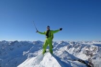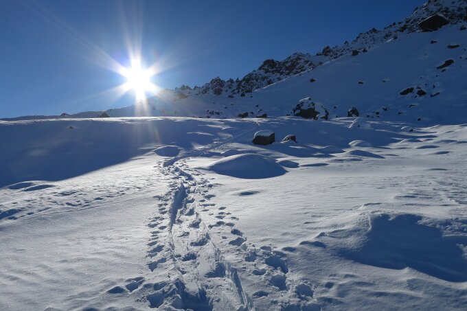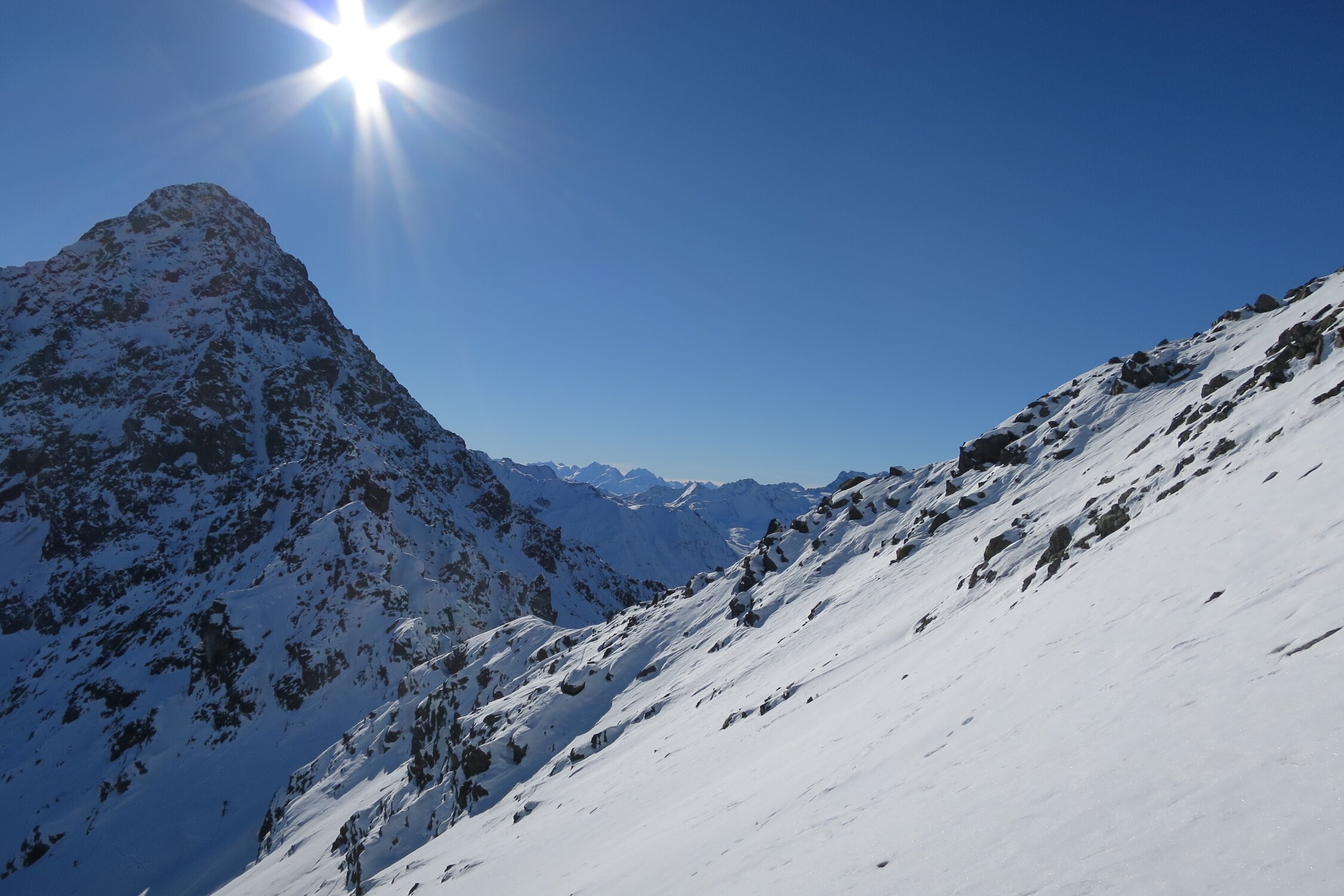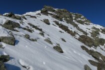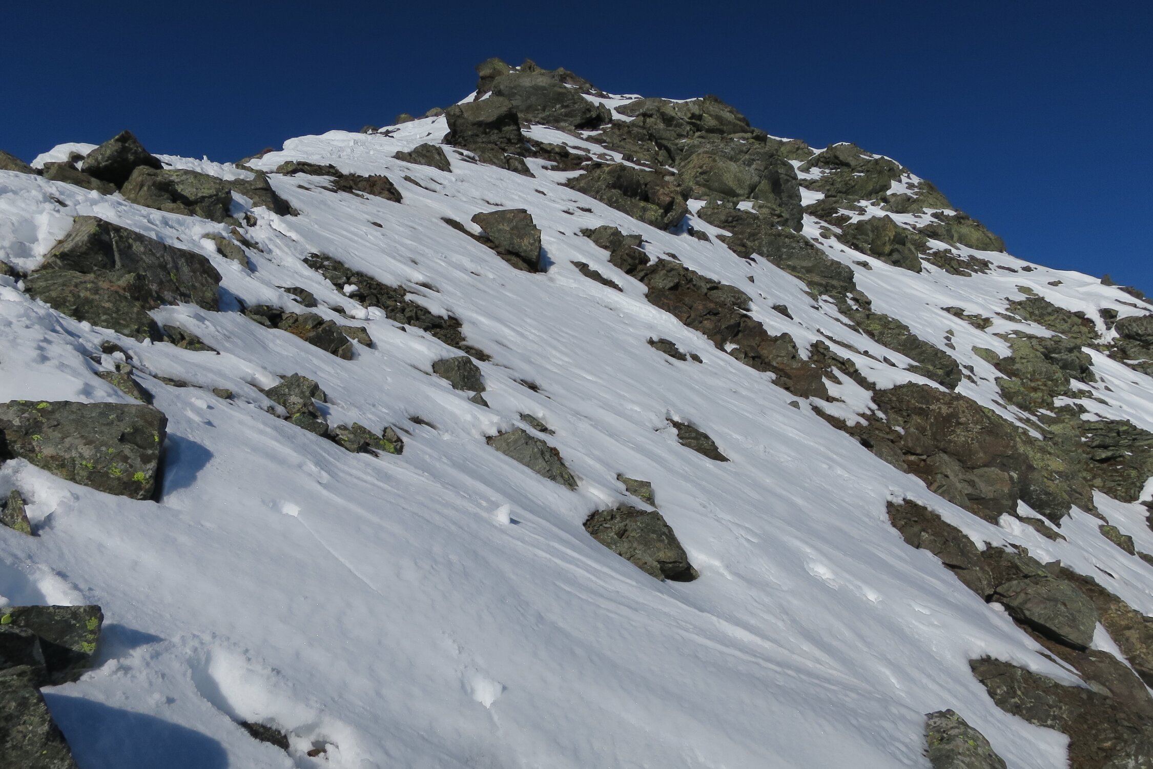 Noch keine Spur auf den Gipfel. Bei ca. 2900m auf den Südgrat gequert. Von dort auf dem Grat auf den Gipfel ohne Kletterei. Gipfelhang (Südost) war sehr "griffig", keine Harscheisen nötig. Fantastische Fernsicht.