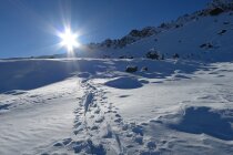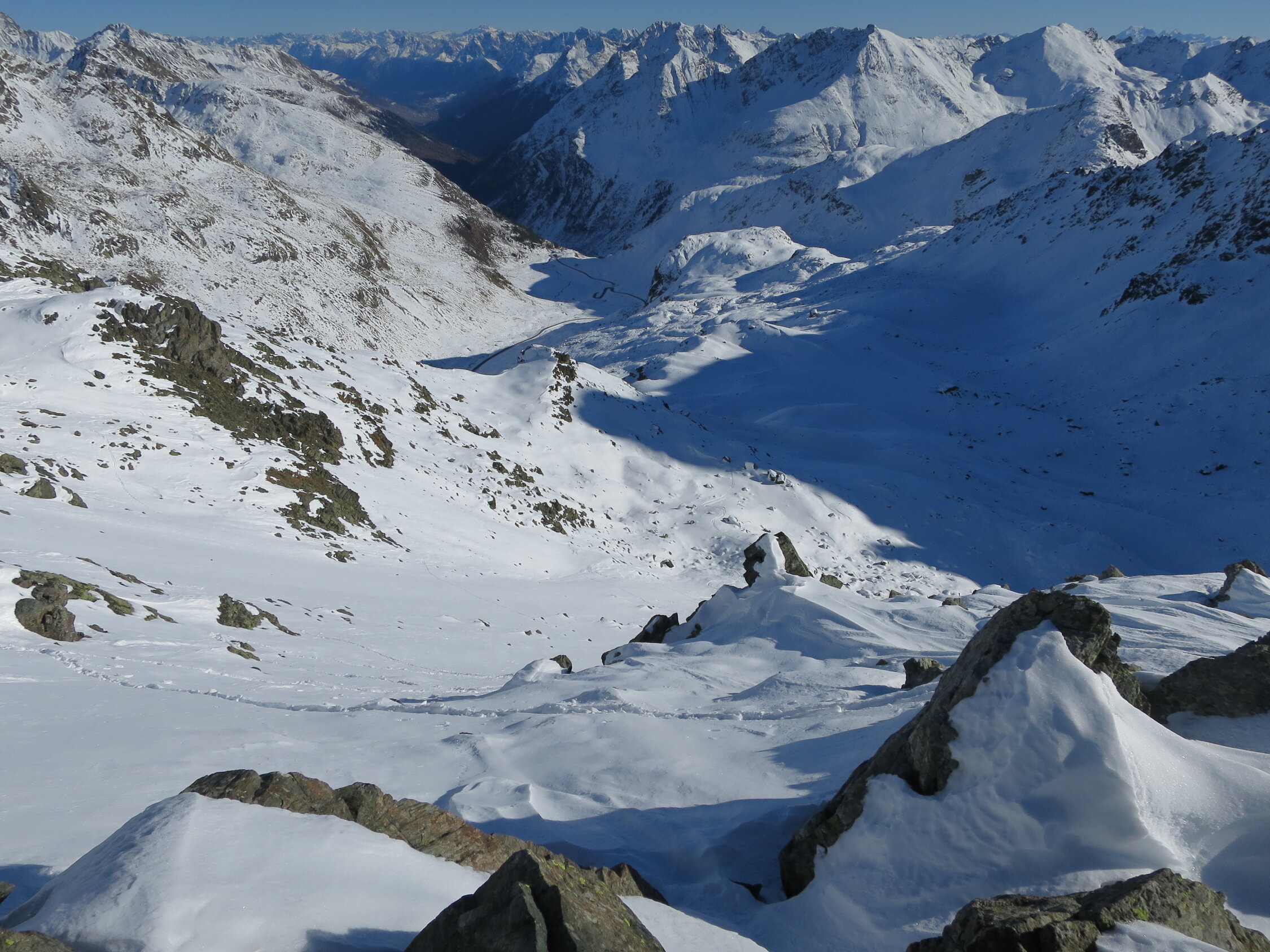 Ingesamt sehr gute Frühwinter-Verhältnisse. In den Schattenhängen ca. 40cm Schnee, z.T. mit Unterlage. Sonnenhänge mit weniger Schnee, aber gut fahrbar.