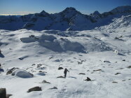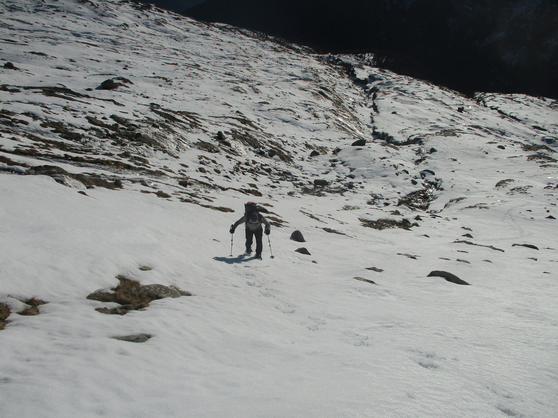 Ohne Schneeschuhe wäre der Aufstieg sehr mühsam bis unmöglich gewesen, auch das Einbrechen im blockigen Gelände wird so deutlich verringert und entschärft. Der Einsatz von Steigeisen und Pickel erübrigte sich gänzlich.