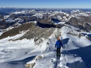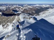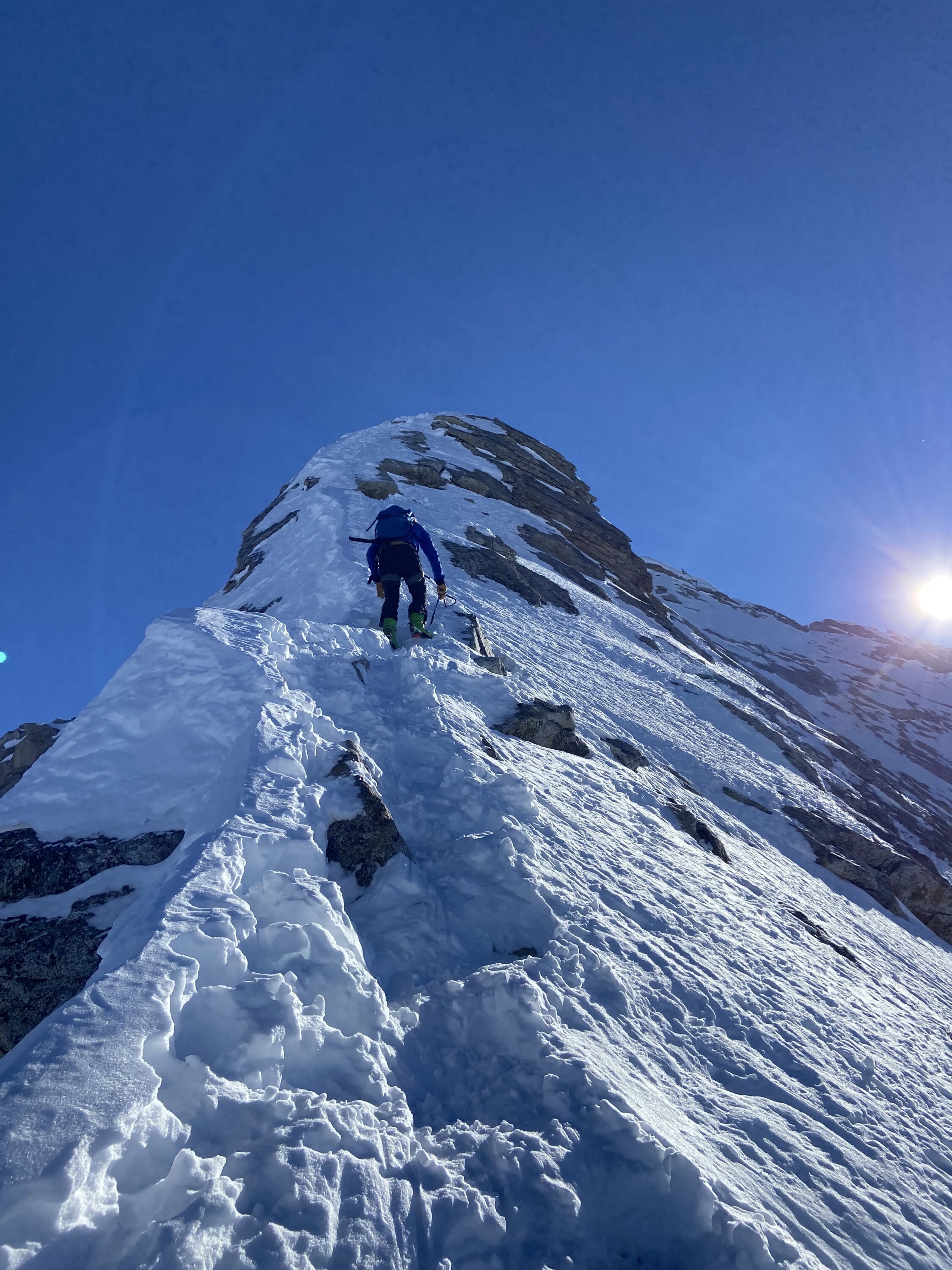 Ca. 100-120hm Aufstieg mit Pickel und Steigeisen durch das Schneefeld in der Nordflanke (gr. Eisbuggl), dann Skidepot und weiter auf den Grat queren und dann in leichter Blockkletterei über den Grat.