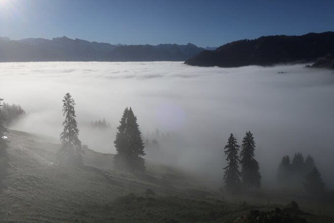 Top-Herbstverhältnisse. Im Abstieg vom Matthorn zu den Chilchsteinen hats noch Schnee und etwas Eis. Für ganz Vorsichtige lohnt es sich evtl. ein Leichtsteigeisen mitzunehmen. Wir hatten gutes Schuhwerk, es ging ganz gut.