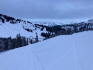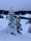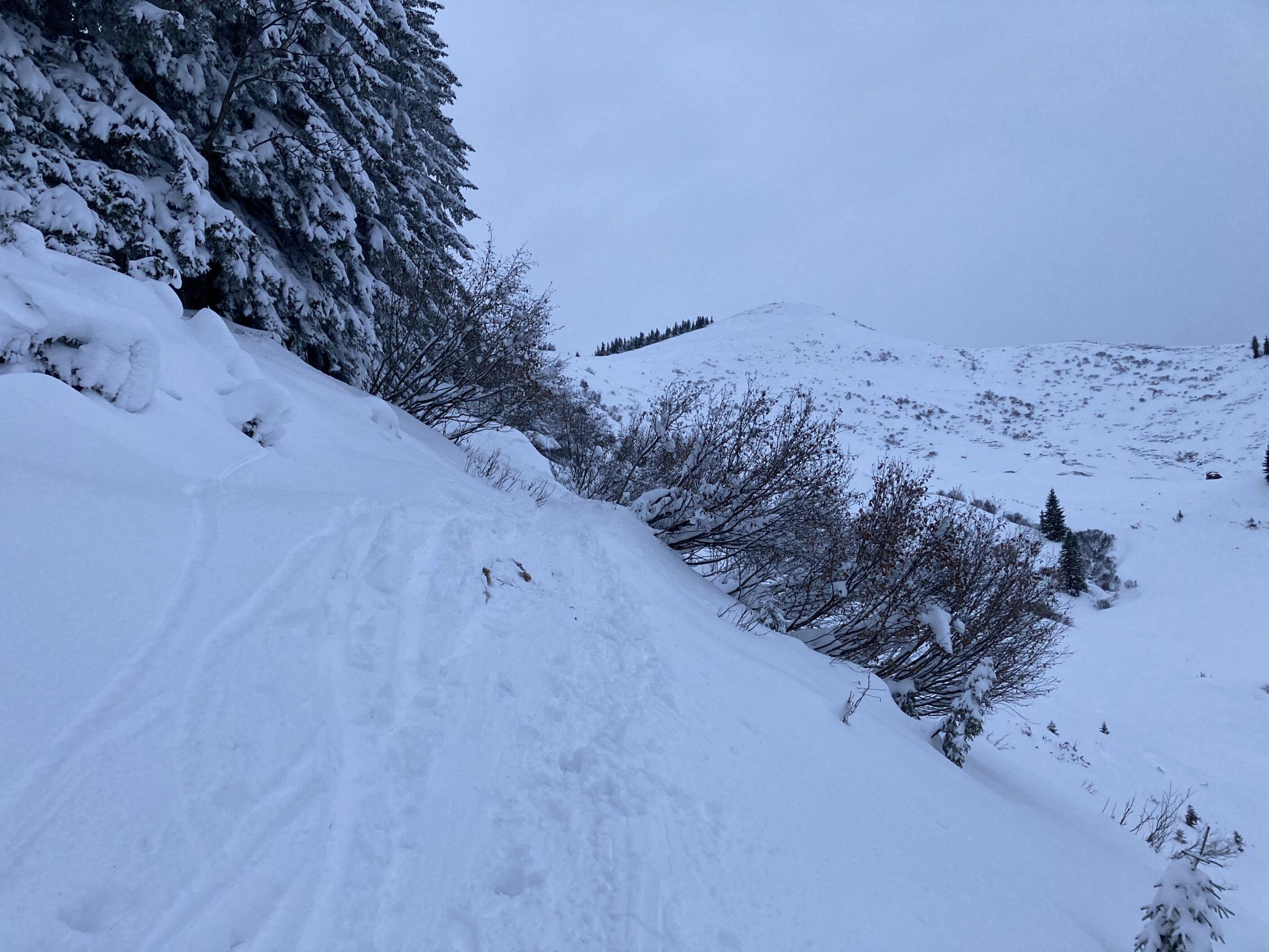 In Summe nun ausreichend und ordentliche Grundlage vorhanden. Das warme Wetter hat heute in der Höhe keinen Schaden angerichtet und die Schneedecke gut setzen lassen. Natürlich war den Schnee nun schwer geworden. Aber immer noch gut zu fahren. Ausserdem kommt ja nun weiterer Nachschub. Bei der Abfahrt um ca 17:00 hat es bereits wieder kräftig bis etwa 1300m geschneit. Insgesamt aber sehr vom Wind beeinflusste Schneedecke mit vielen Dünen, also bereits Vorsicht im steileren Gelände!