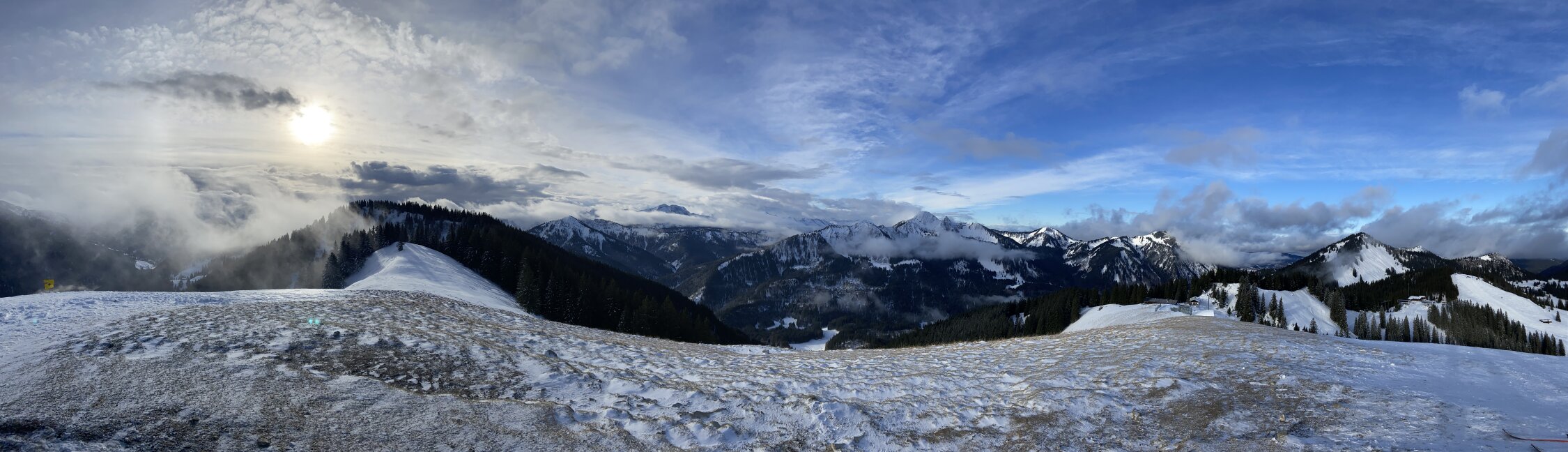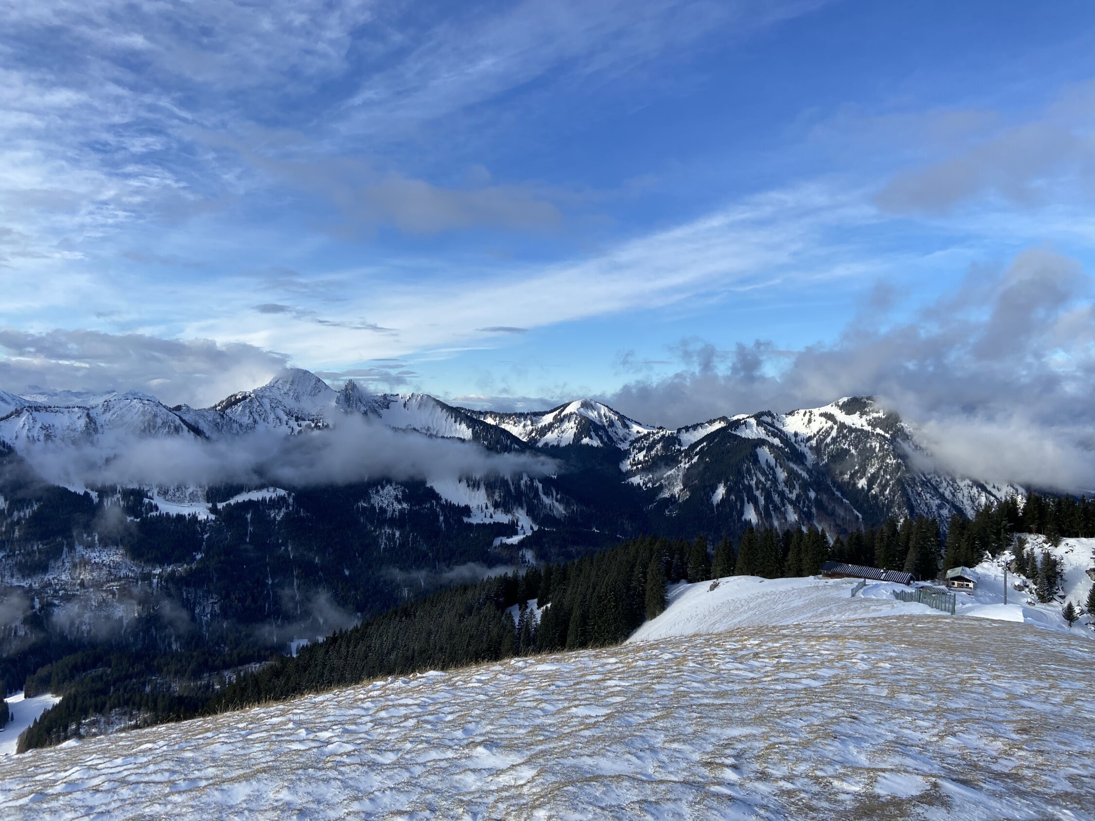 Westseiten abgeblasen, in den Nord- und Osthängen aber ausreichend Schnee.