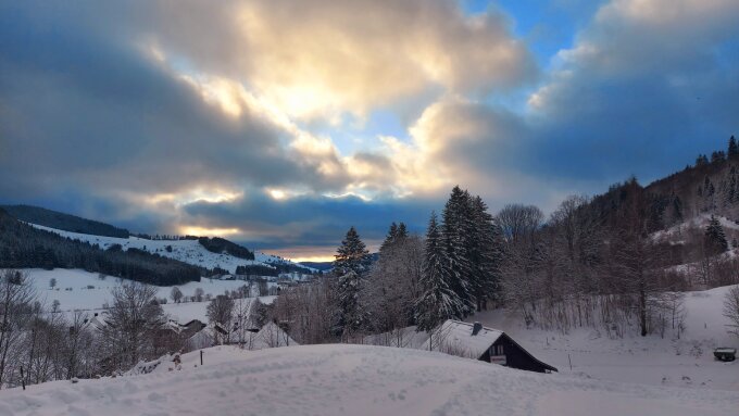 Bis zum Kohlplatz folgte ich dem leicht eingeschneiten, aber schon mal gewalzten Rodelweg. Bis zum oberen Hofmättle anstrengende Spurarbeit. In den freien Lagen oben wieder leichtes Vorankommen.
