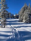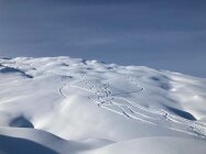 Die Schratte ist bereits erstaunlich gut eingeschneit. Leider fehlt aber die Unterlage, deshalb Steinkontakt möglich. Pulverschnee, leicht fahrbar.
