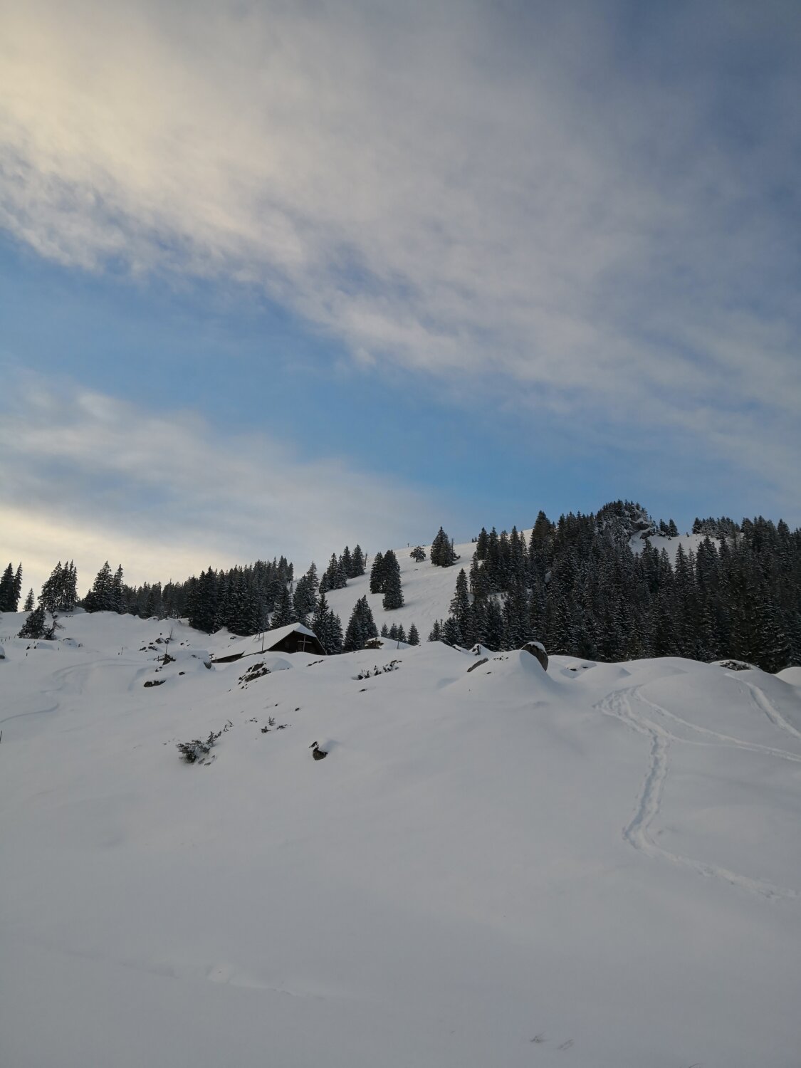 Tip top eingeschneit, unten ca. 20cm ab 1300m 50cm Schnee. Powder pur, kein Steinkontakt