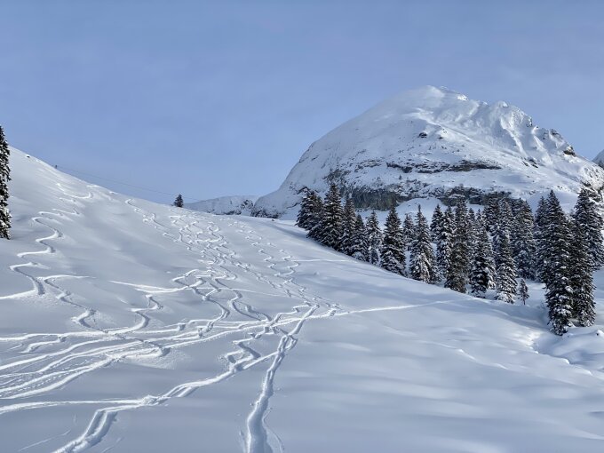 Herrlicher Tag für den Saisonstart. Reichlich Schnee ab Parkplatz. Fantastischer Pulverschnee auf der ganzen Tour. Kein einziger Steinkontakt, was für Anfang Dezember eher ungewöhnlich ist.