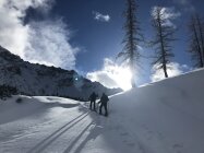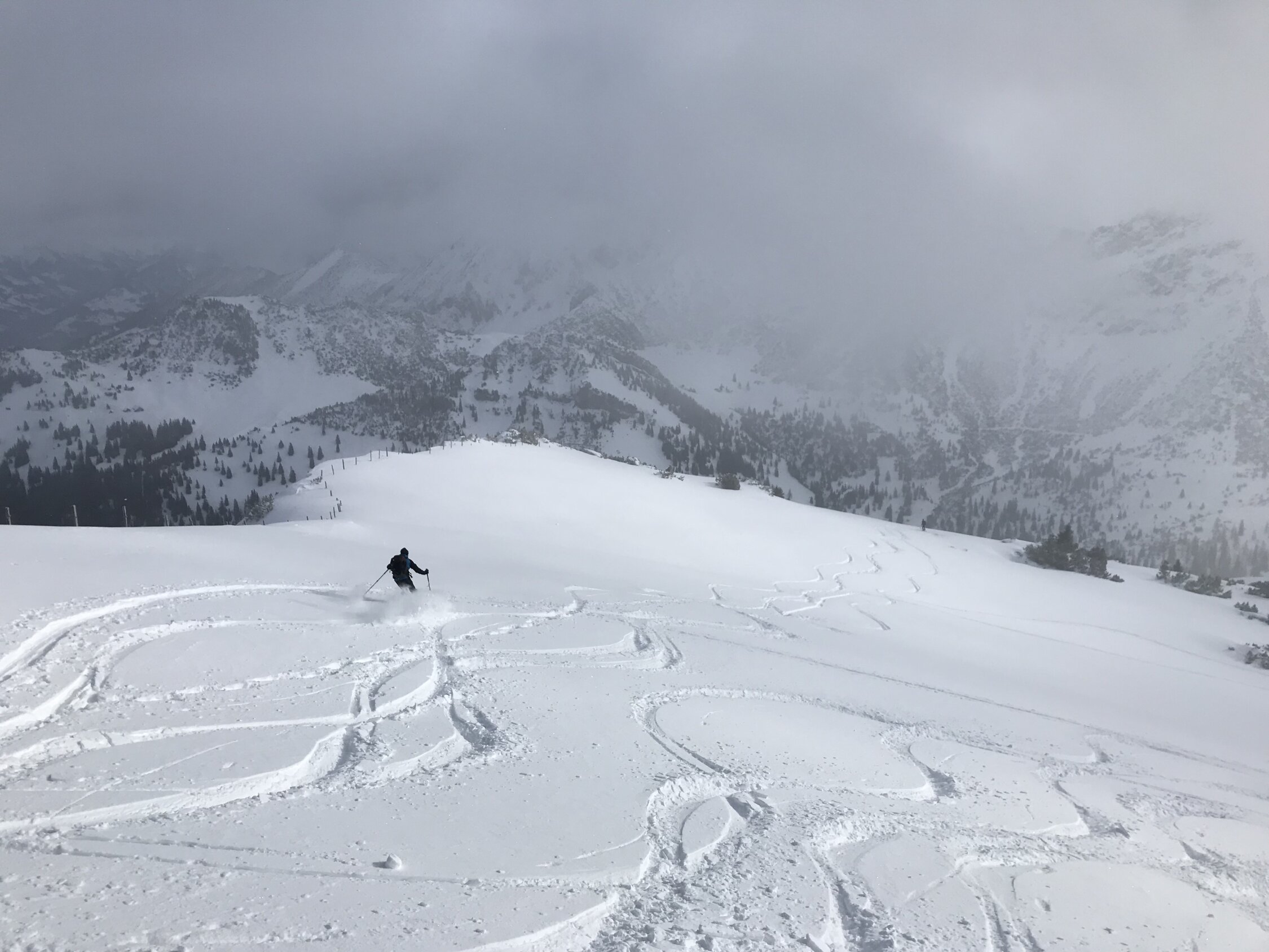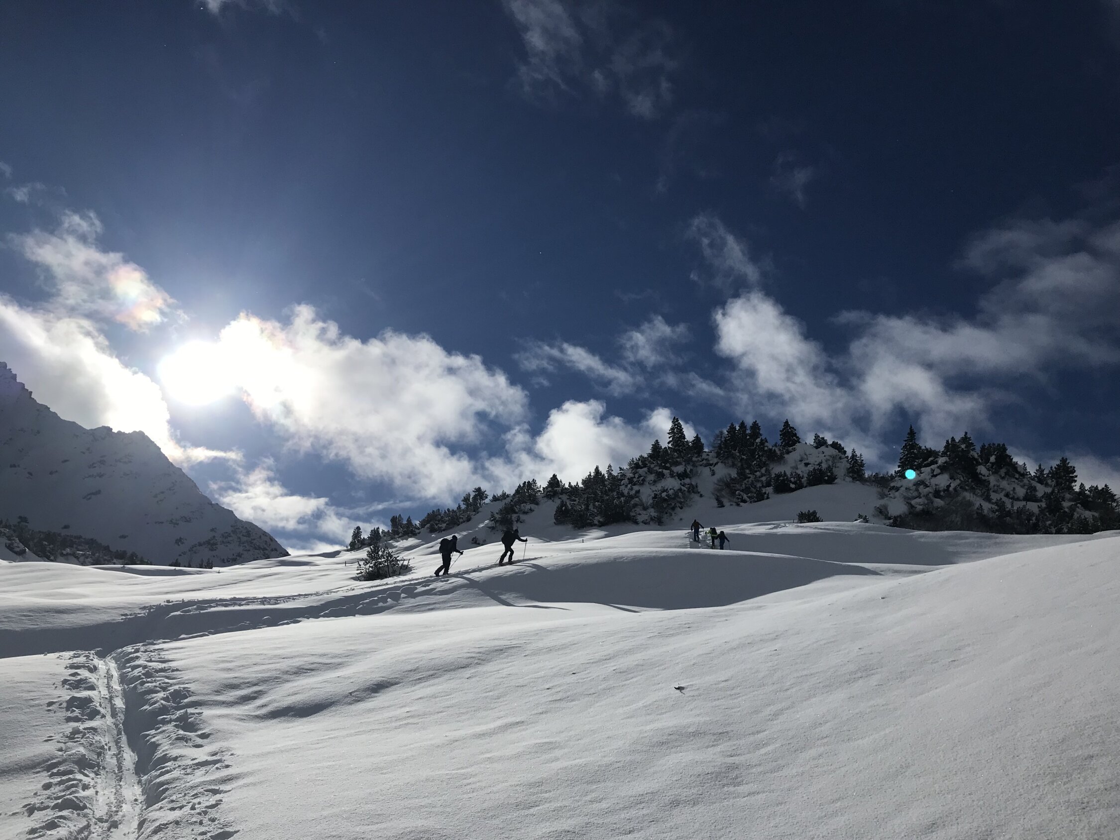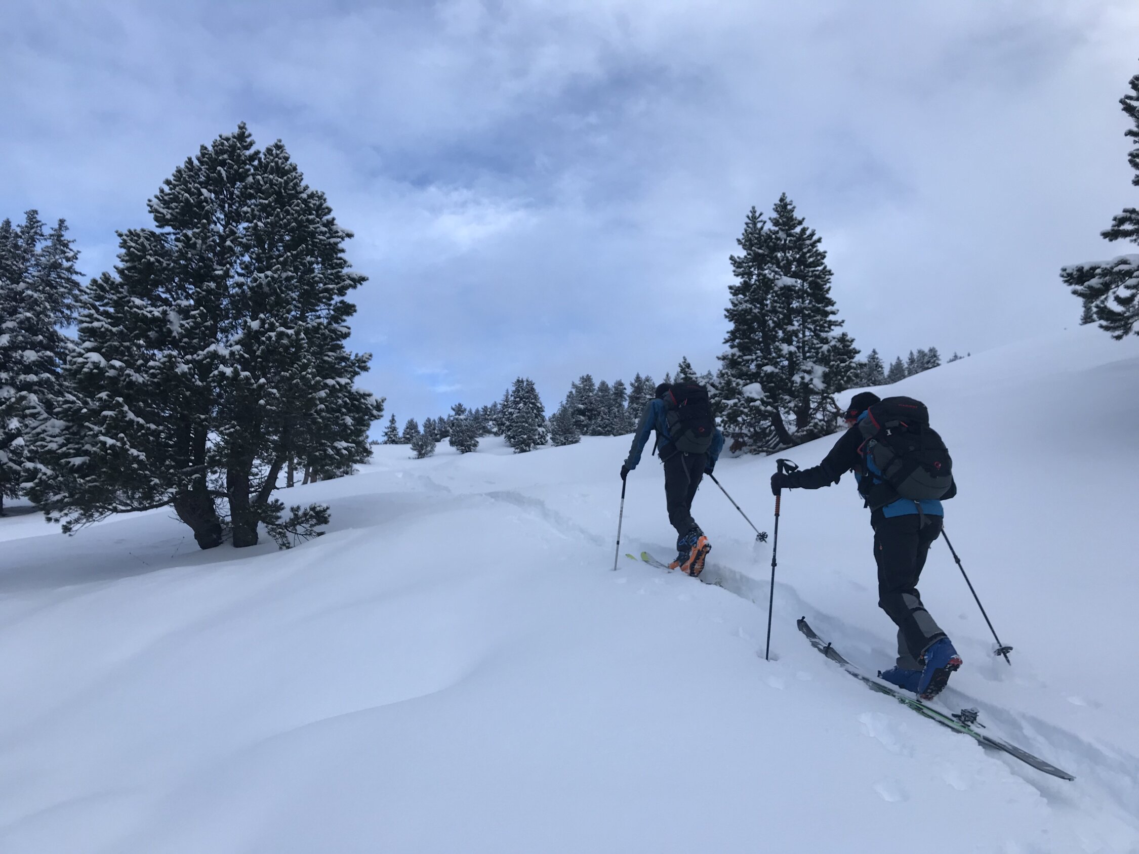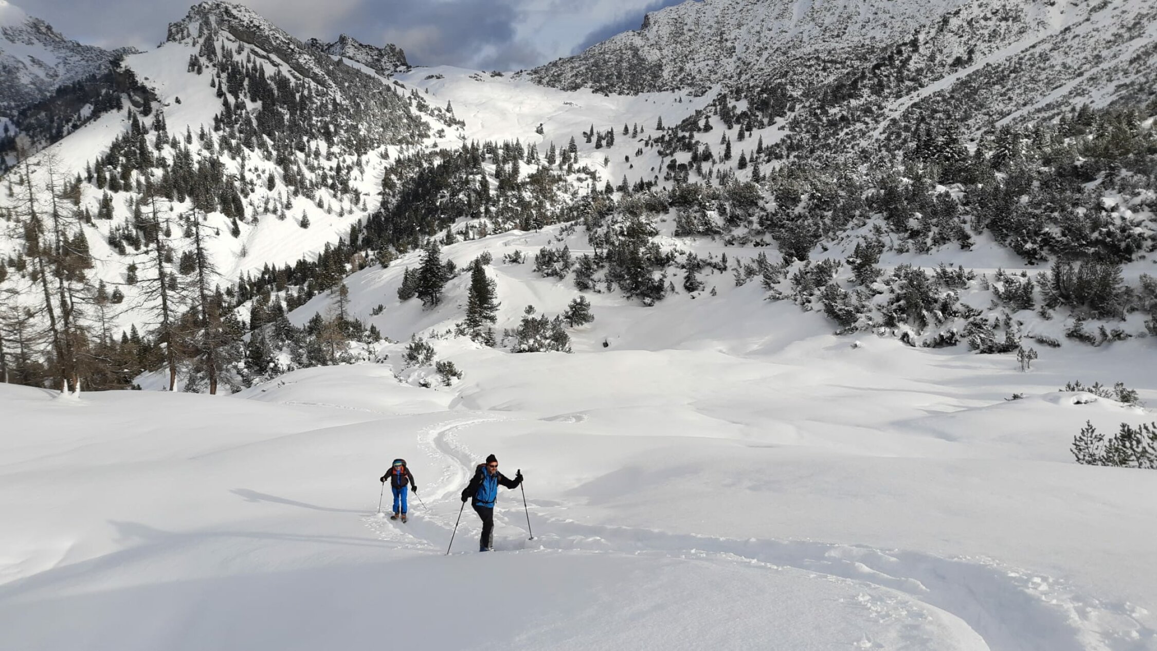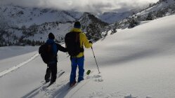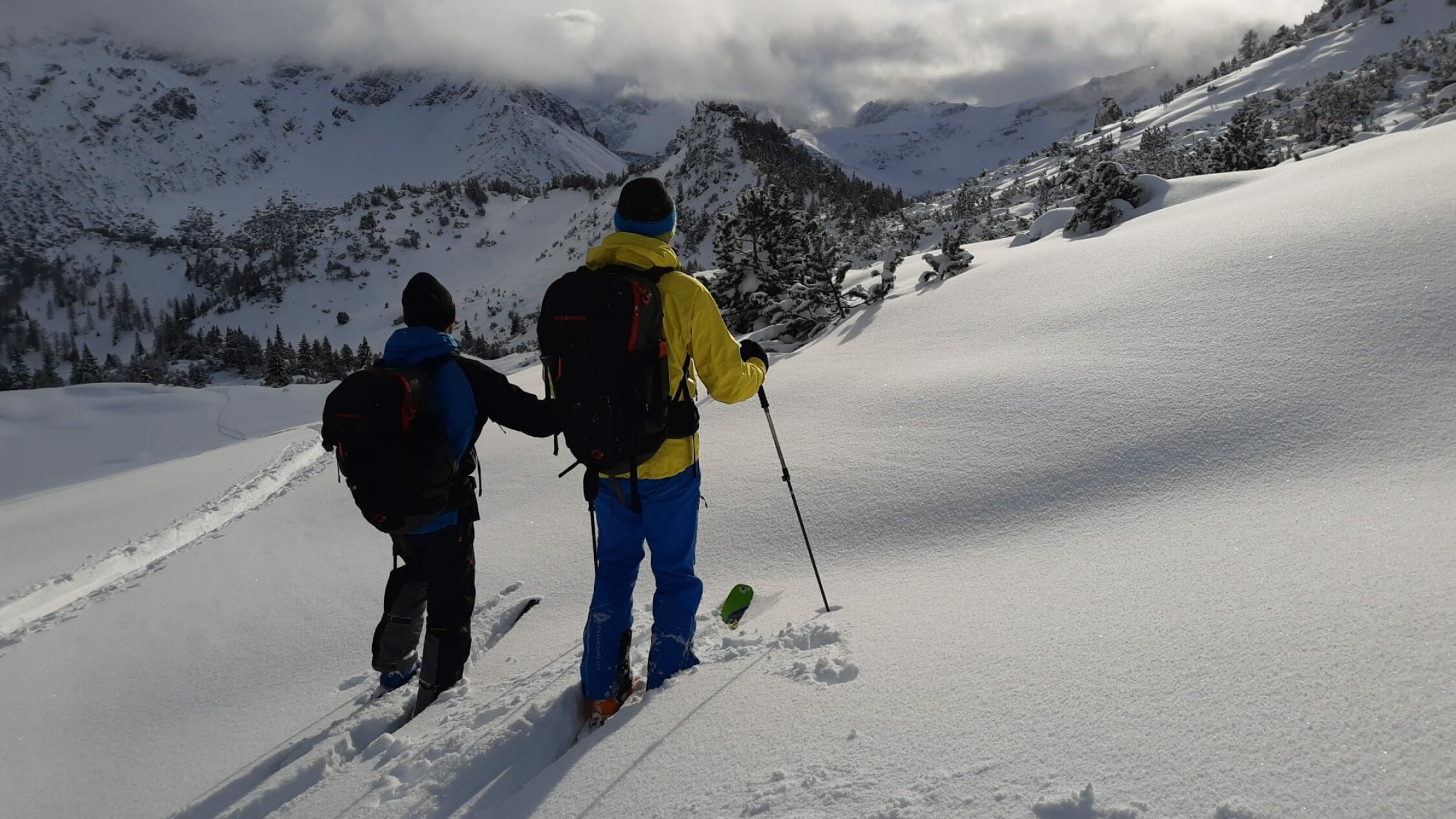 Wetter anfangs noch stark bedeckt, dann immer besser und am Mittag etwas Sonne. Die ganze Tour hat ausreichend Schnee. Gestern Nachmittag hat es leider auf den Pulverschnee geregnet, deshalb hat der Schnee im unteren Teil bis ca. 1850 Hm eine Kruste. An den Gipfelhängen liegt schöner Pulverschnee.