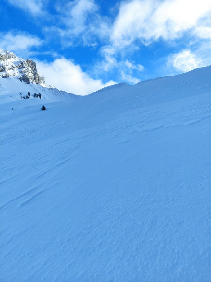 Über Nacht gab es nur wenige cm lockeres Schümli. Genug Altschnee ab Niederrickenbach. Ab Brisenhaus alles völlig verblasen. Meist bis auf die Regenkruste vom Samstag. Viele Triebschneelinsen.