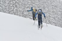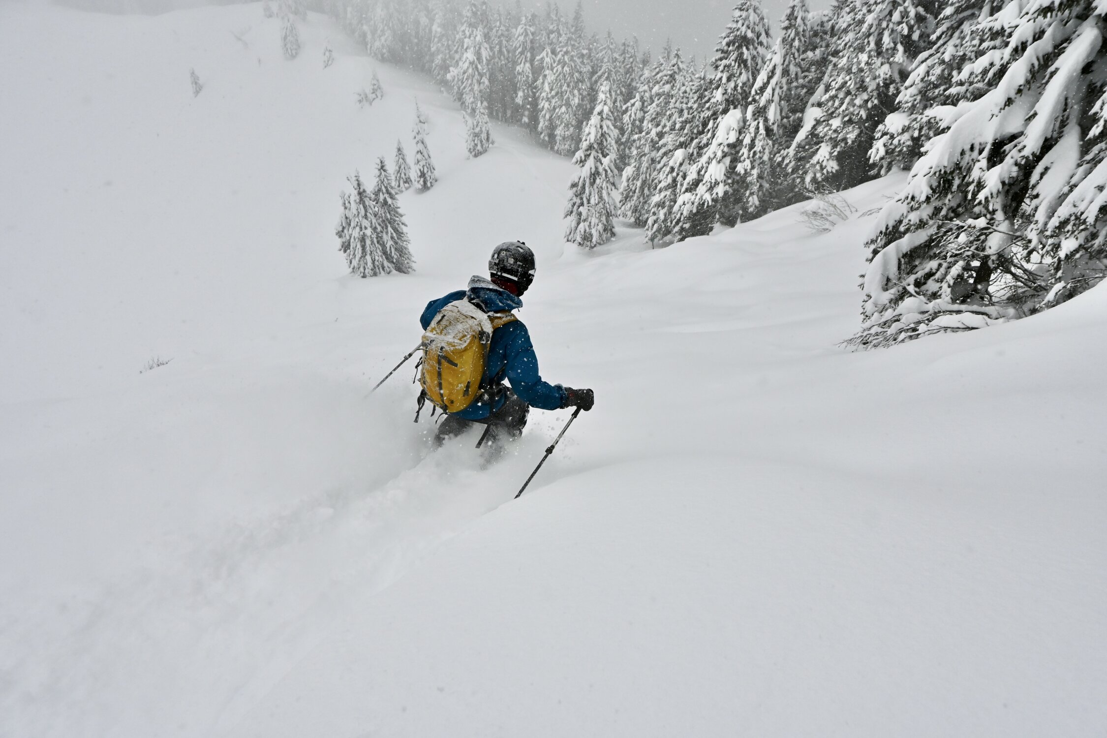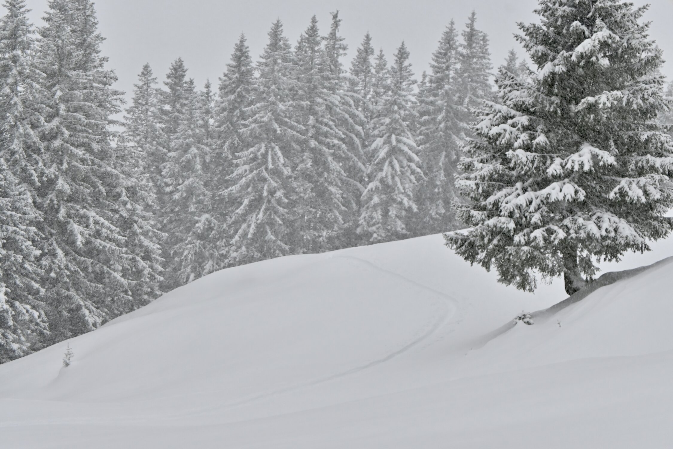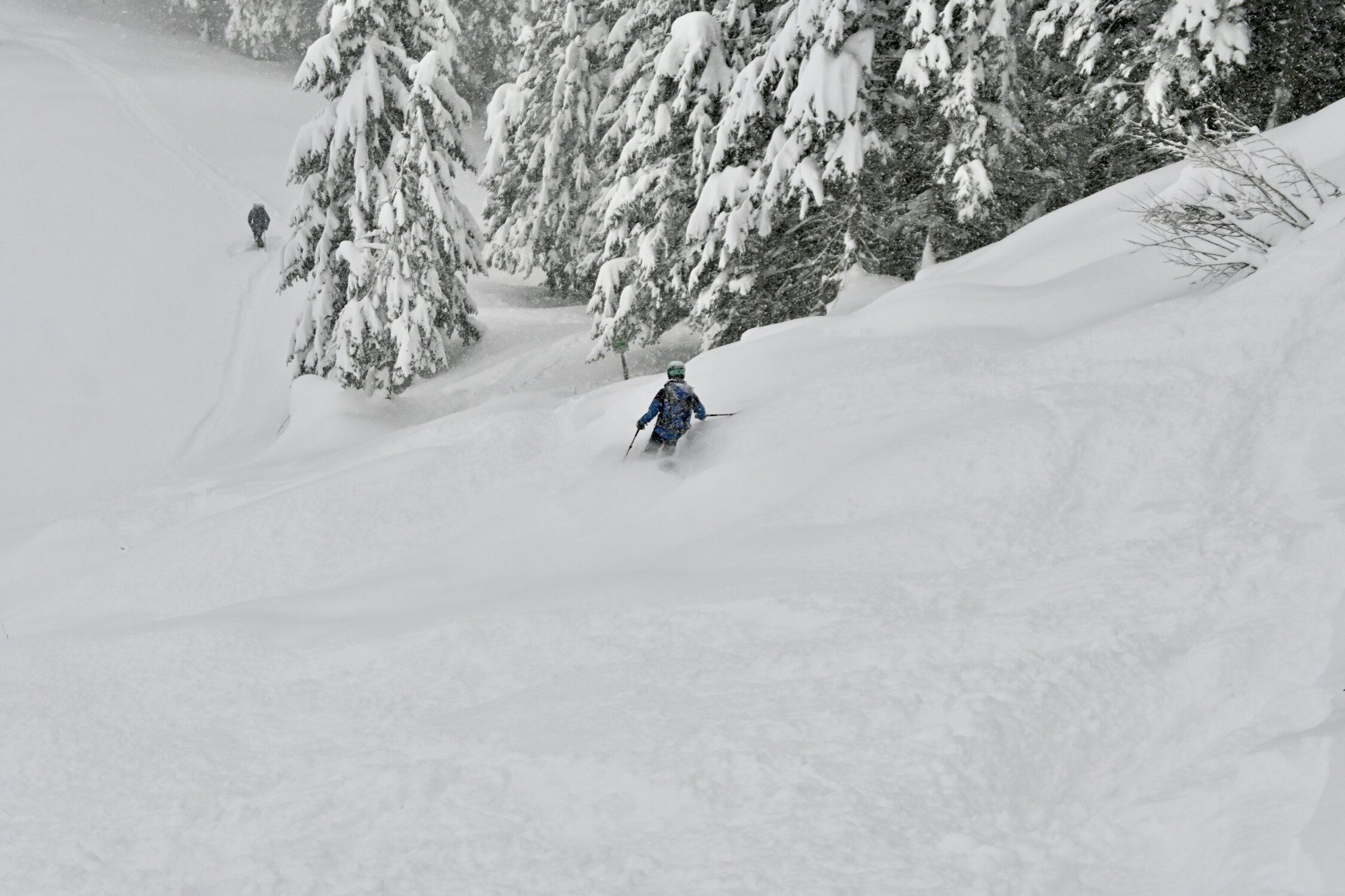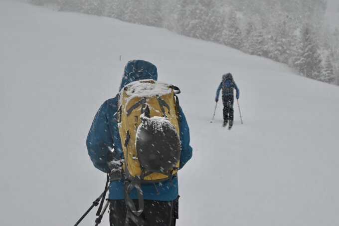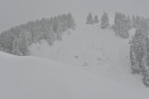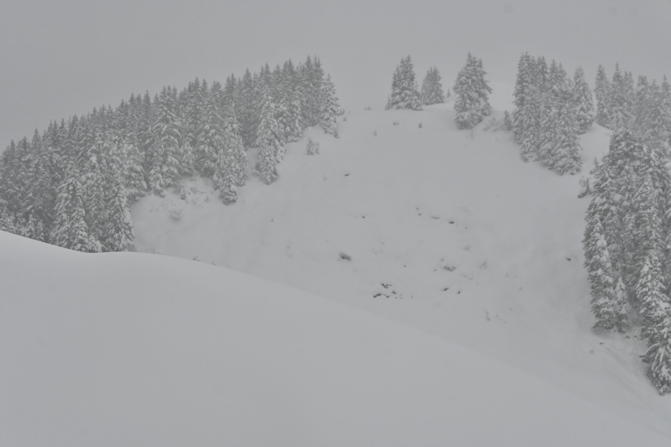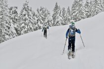 Im ersten südexponierten, etwas steileren Hang ganz unten bis auf ca. 1350m noch wenig Schnee bzw. teilweise fehlende Unterlage, hier ist Vorsicht geboten wenn die Ski bereits beim Service waren. Nach oben hin dann immer besser bis perfekt bei ca. 20-30cm Pulver auf ausreichend Unterlage.