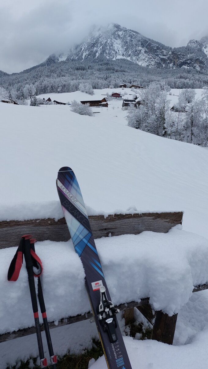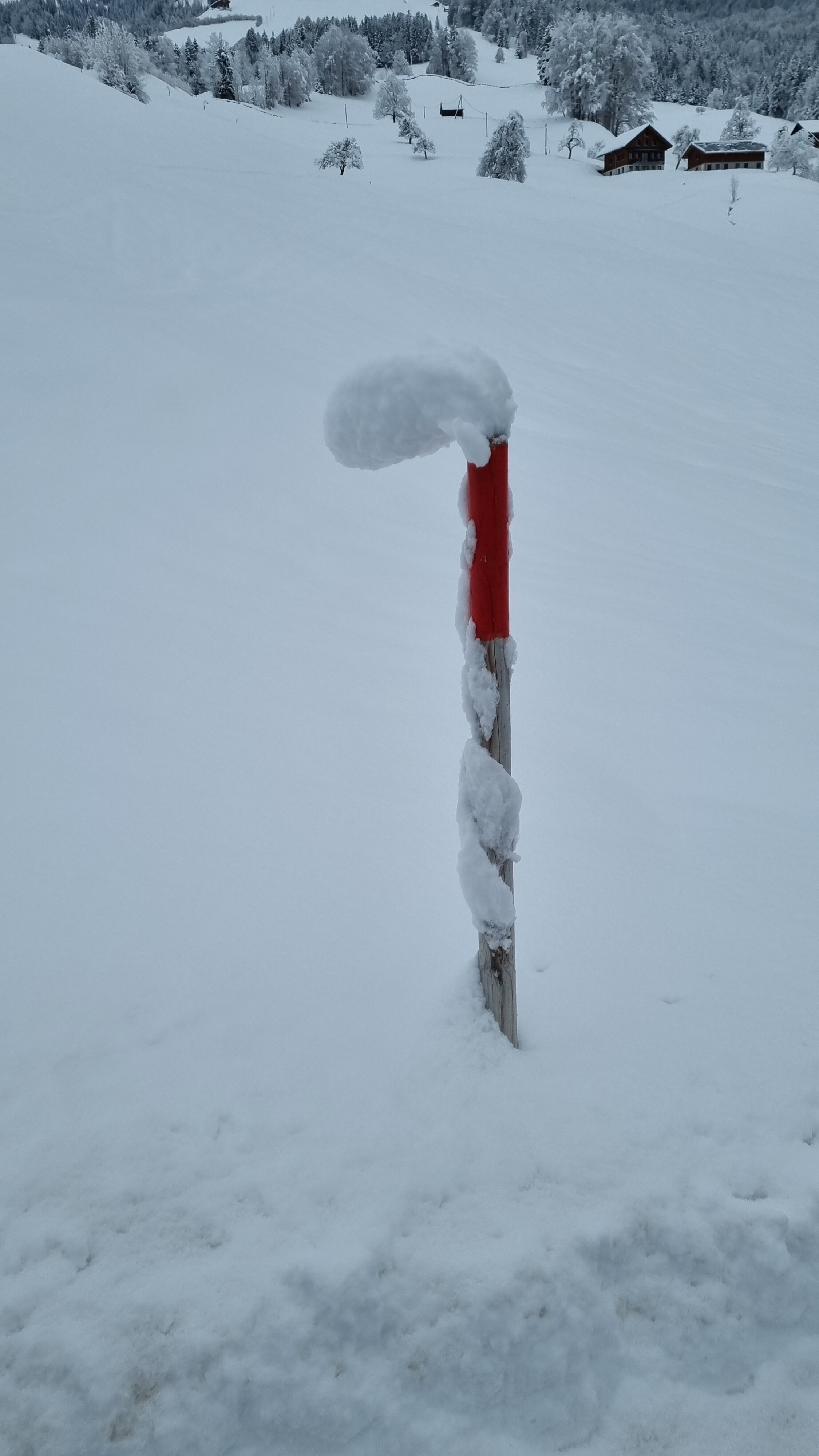Genug Schnee ab Schwyz (ca 30cm), schnell zunehmend in der Höhe. Oben mindestens 80cm gemessen. In den Mulden noch viel mehr. So macht es Spass! Eigentlich fast zu viel für die flacheren Passagen. Der Schnee scheint auch ohne viel Windeinfluss gefallen zu sein. Am Nachmittag wurde er unterhalb von ca 900m recht feucht (2°C in Schwyz).