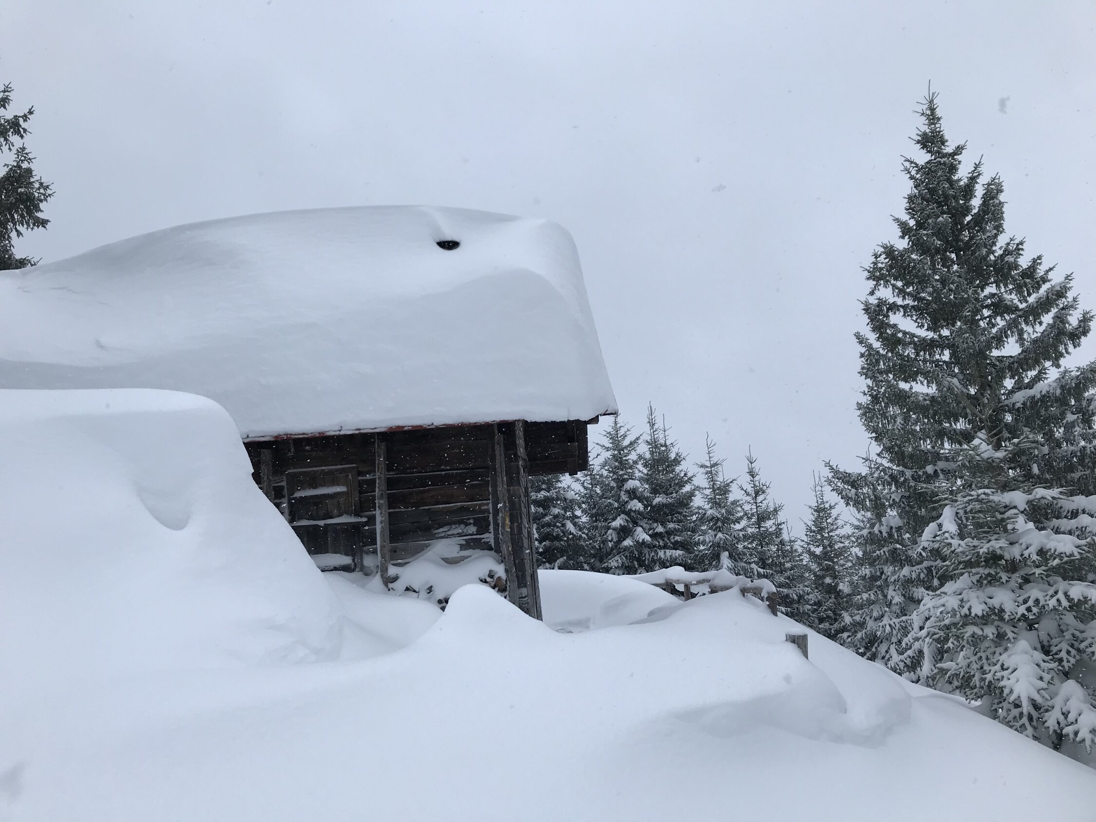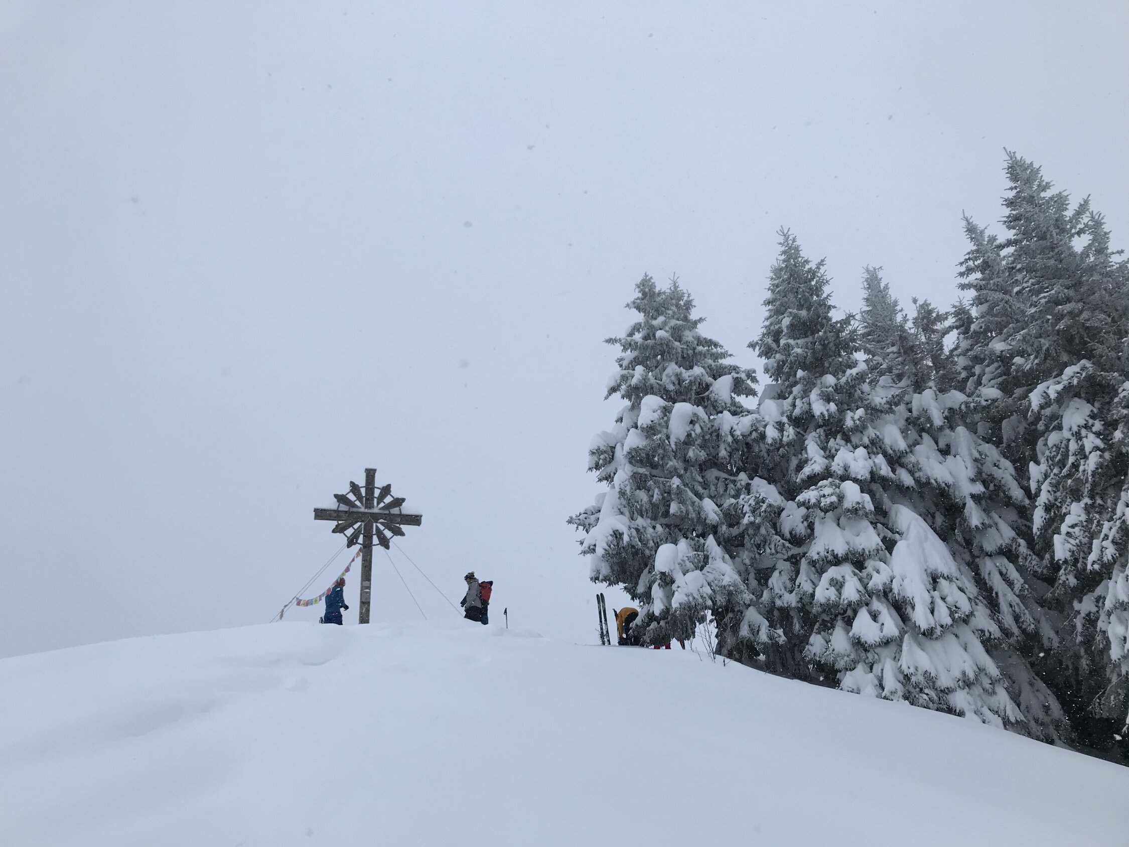 Leichter Schneefall, aber gute Sicht. Aufstieg problemlos, Abfahrt vom Vortag schon etwas zerpflügt. In den flacheren Passagen fast zu viel Schnee, bremst dann doch, vor allem, weil der Pulver zum Teil gebunden war.