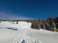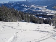 Immer noch unverspurte Hänge in der Abfahrt genossen. Mit der Sonneneinstrahlung wird der Schnee wieder schwerer, für uns war es nur knapp vor Steinerberg spürbar.