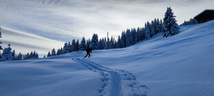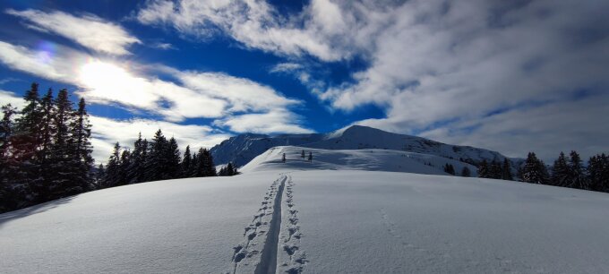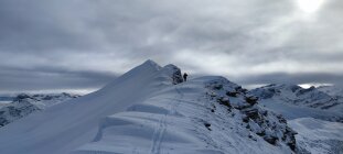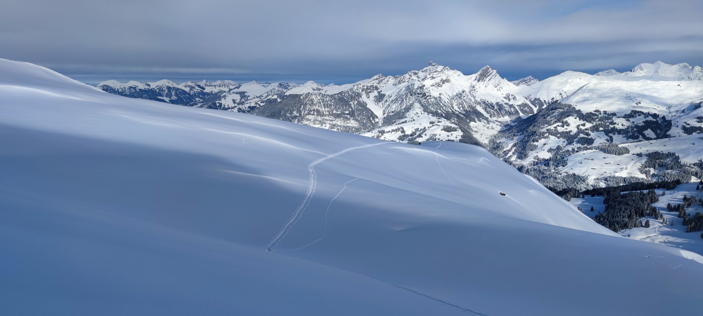 Powder vom feinsten. Aufgrund der Lawinenlage oben die steilsten Bereiche gemieden. Sicherlich angenehmer bei besser verfestigtem/ ausgefahrenem Schnee da viele flache Stellen. Einige Tourengänger sind nur bis Hinder Laserberg gegangen. Wir mussten von dort bis Gipfel spuren. Im sonnigen Osthang der Rüwilshore gab es kleine Lockerschnee-Lawinen die vermutlich von Wechtenabbrüchen ausgelöst wurden. Unsere Spur meidet diesen Bereich.