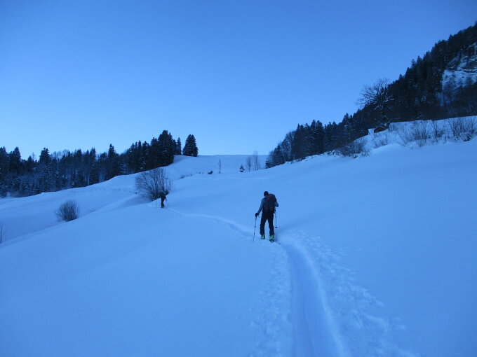Schneemäßig fast schon zuviel des Guten: Üppiger Pulver (im Gipfelhang ca. 11.30 h allerdings schon etwas schwer geworden) machte den Abstieg außerhalb der Spur mühsam. Auch für Vladi auf Skiern war die Abfahrt durchs oft wenig steile Gelände der Risipassroute etwas mühsam.