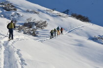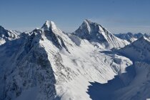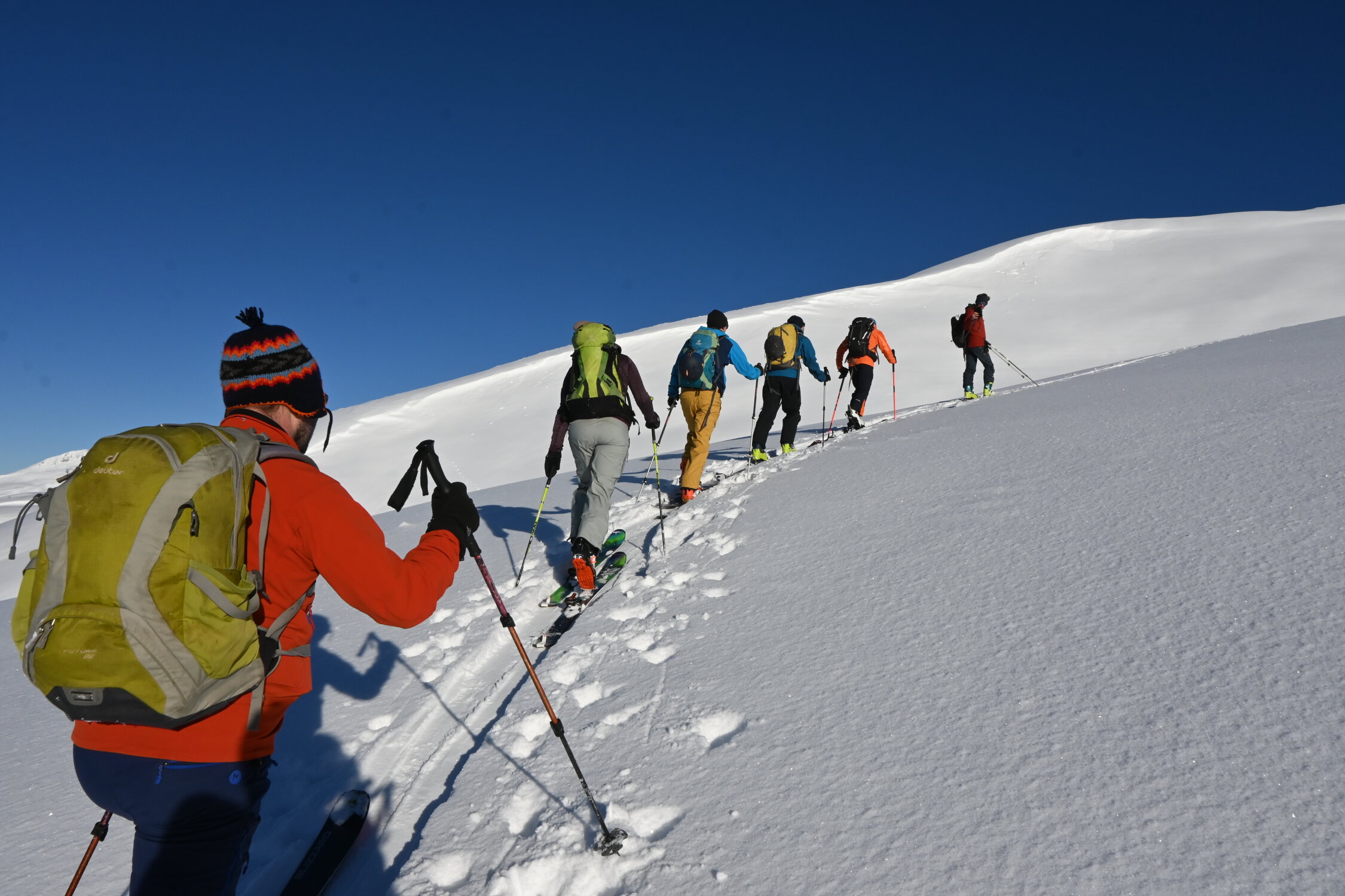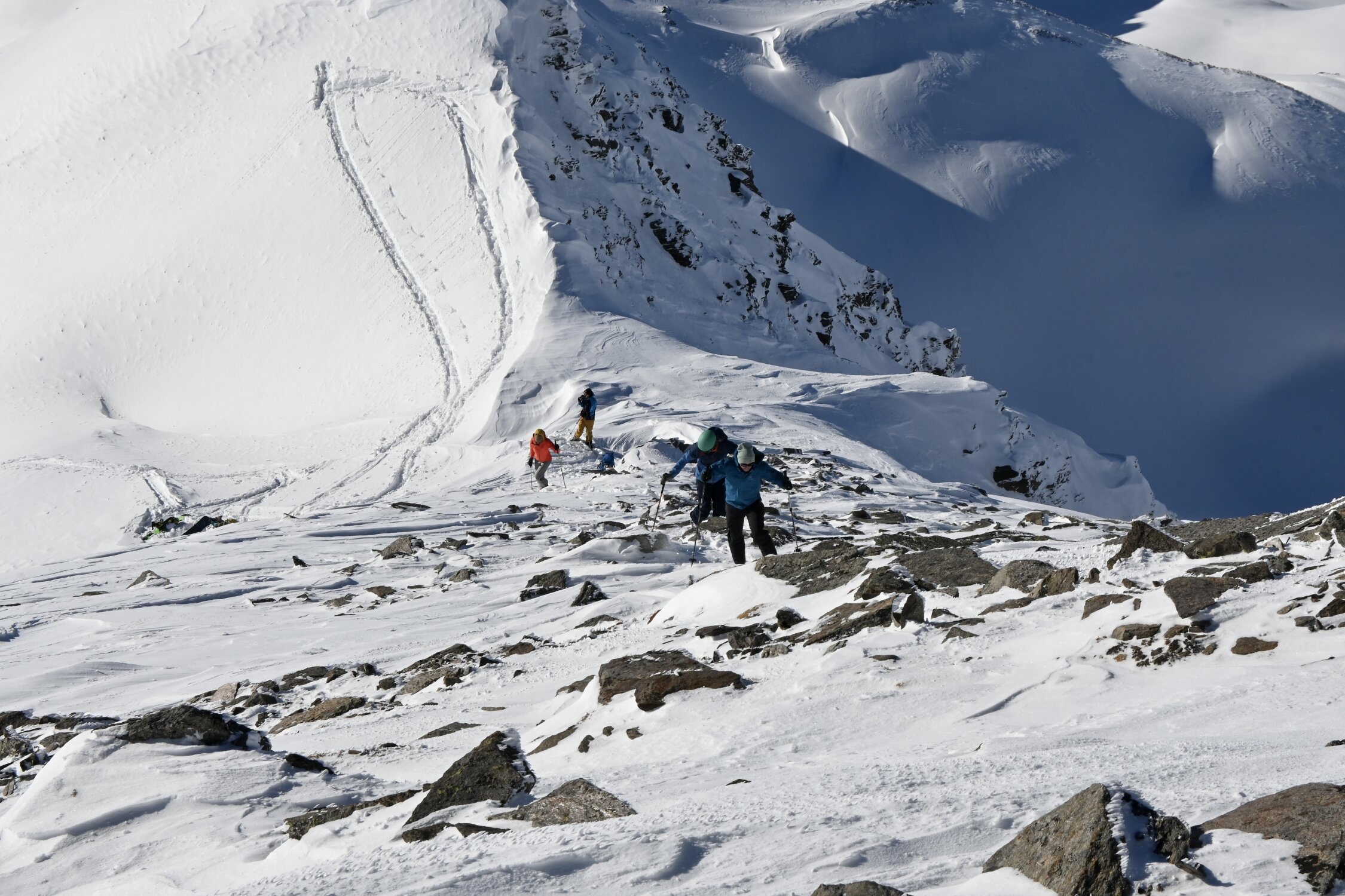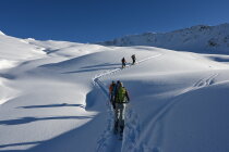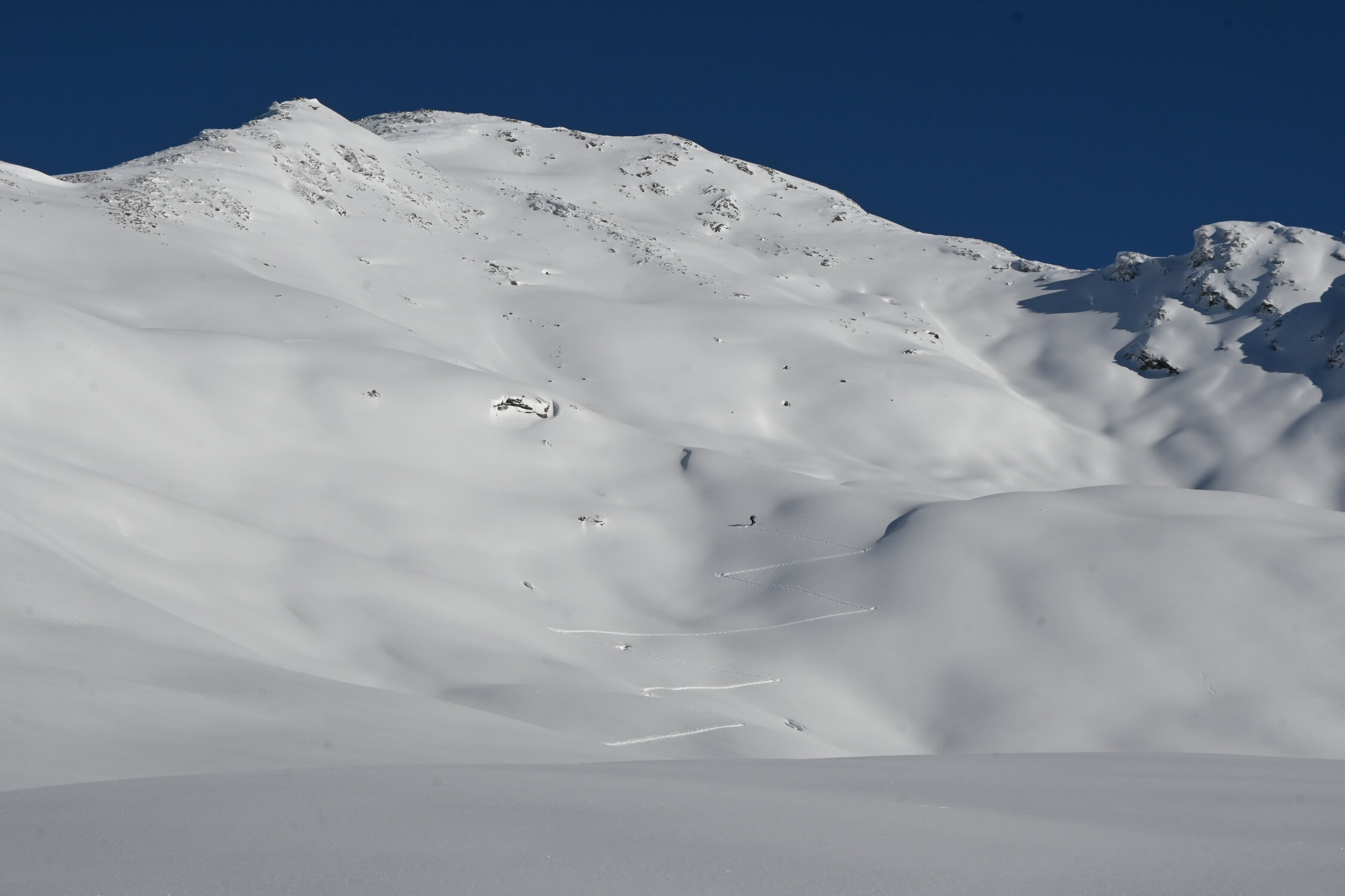 Ca. 20-40cm Pulver, ganz unten sowie teilweise im Gipfelhang etwas knappe Unterlage, insgesamt aber sehr gute Verhältnisse. Die letzten 50hm abgeblasen, daher zu Fuss zum Gipfel.