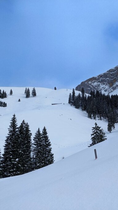 Leider viele Weidezäune mit gespanntem Stacheldraht, nicht komplett eingeschneit, v.a. in der Abfahrt "störend". Wenige, schmale Öffnungen vorhanden.