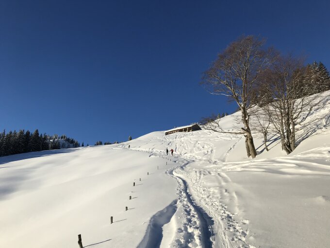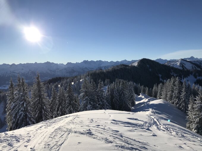 Klasse Wetter und schöner Pulver. Wir sind vom Gipfel nach Westen abgefahren und noch zum Ochsenkopf aufgestiegen. Retour wieder über Rangiswanger.