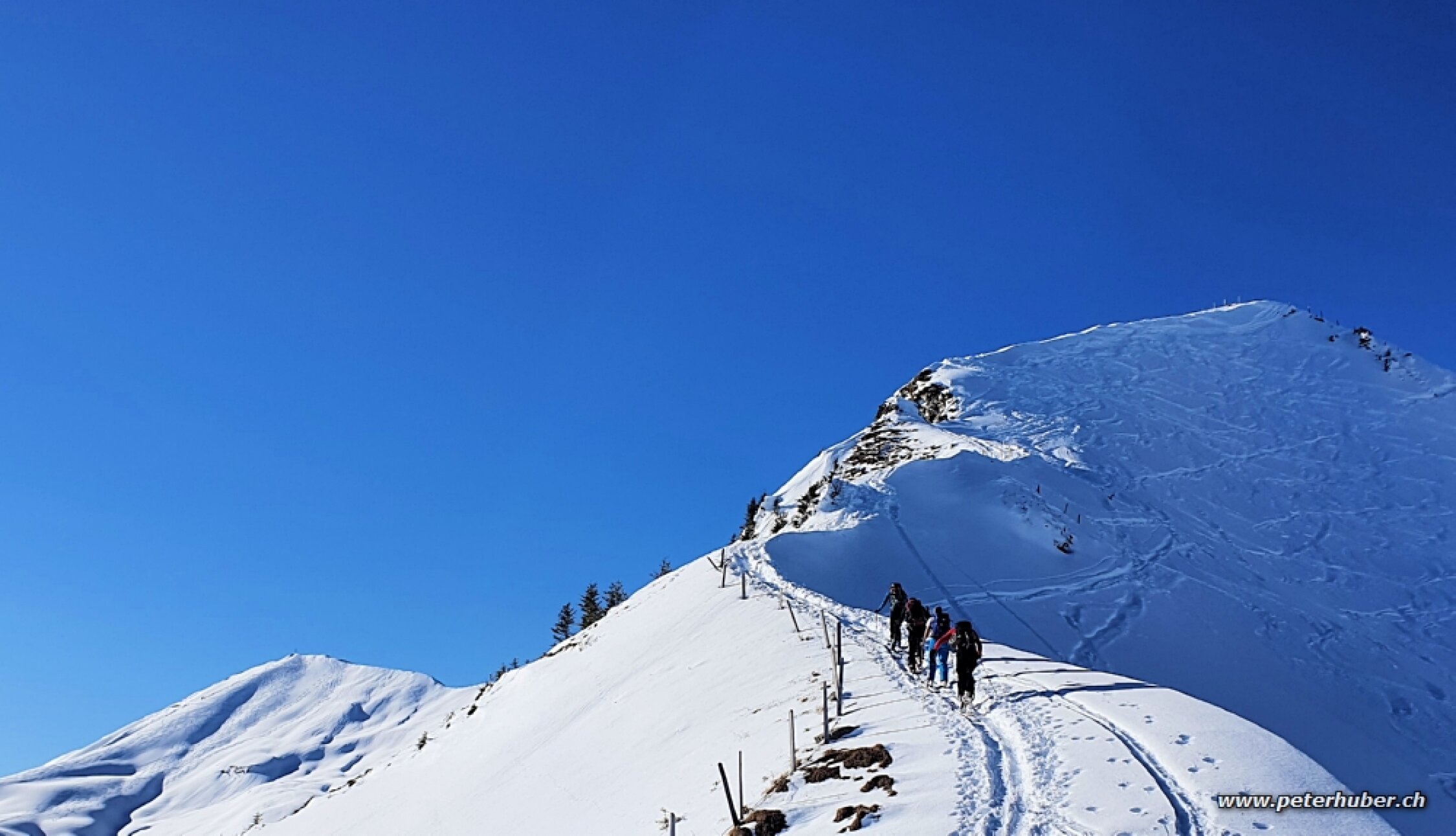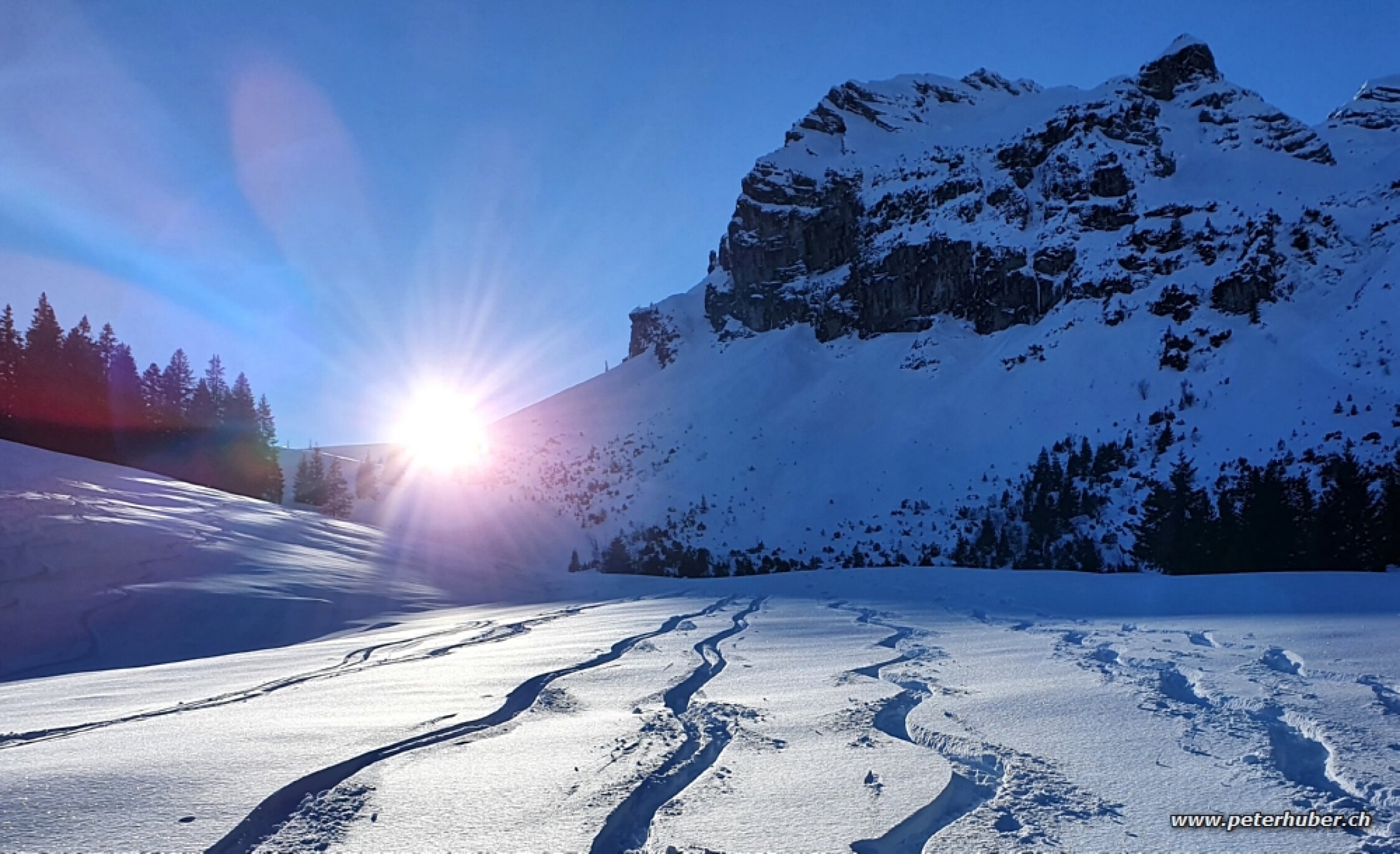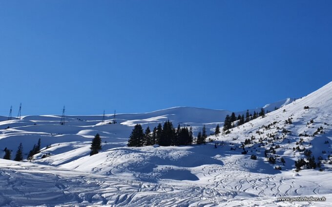 Abfahrt: Gipfelhang leicht windgepresst. Mit Kraft fahrbar. Dann einige schöne Mulden. Es hat jedoch schon etliche Spuren vom Wochenende. Bis in den Wald hinunter recht schön zu fahren. Dann auf der Waldstrasse zurück zum Parkplatz. Der war heute morgen um 9:30 gut gefüllt.