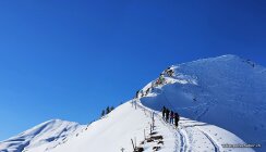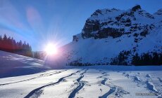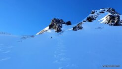 Schönes Wetter, kaum Wind. Recht warme Temperaturen, leicht im Plus. Es hat genug Schnee, jedoch merklich weniger als in SZ. Oberhalb der Fluonalp ist der Schnee windgepresst und teilweise auch verfrachtet. Es gibt Kuppen mit Gras. In den Mulden ganz OK. Gute Spur auf der ganzen Strecke. Stollen an den Fellen gehörten heute zum Programm.