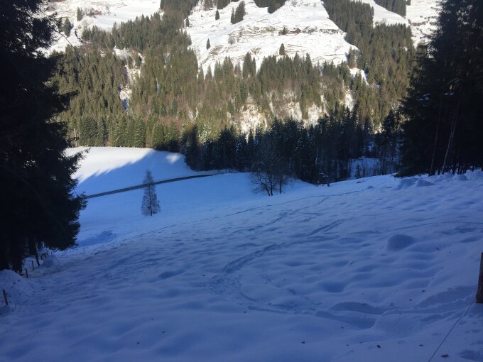 ab Start 30 cm, rasch zunehmend, oben 50cm auf durchwegs guter Unterlage. Es hat noch genügend Platz für eigene Spuren...