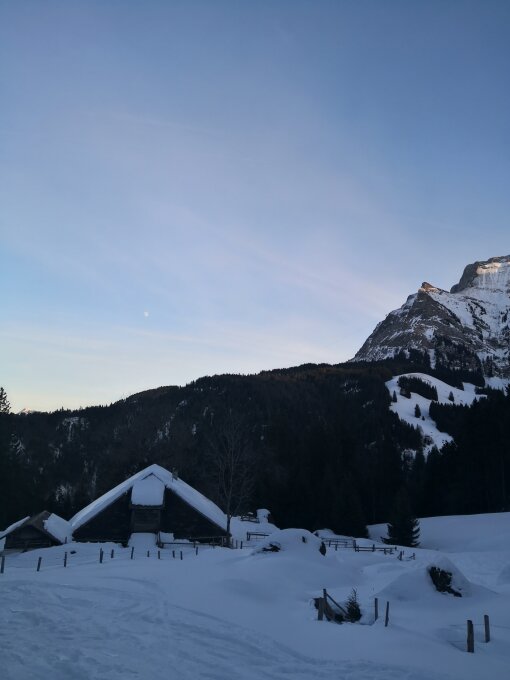 Bei angenehmen Temperaturen um 15.30 gestartet, oberhalb vom Nebel. Alles im Schatten zügig auf den Gipfel, dieser ist abgeblasen, Ski einige Meter unterhalb deponiert, gerade rechtzeitig zum Sunset Schauspiel eingetroffen. Einfach immer wieder Magisch.