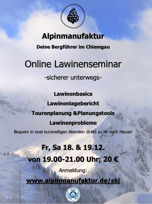 Zur Lawinenunfallprävention bieten wir am Wochenende ein Online Lawinenseminar an. Mehr Infos im Flyer bei den Bildern.