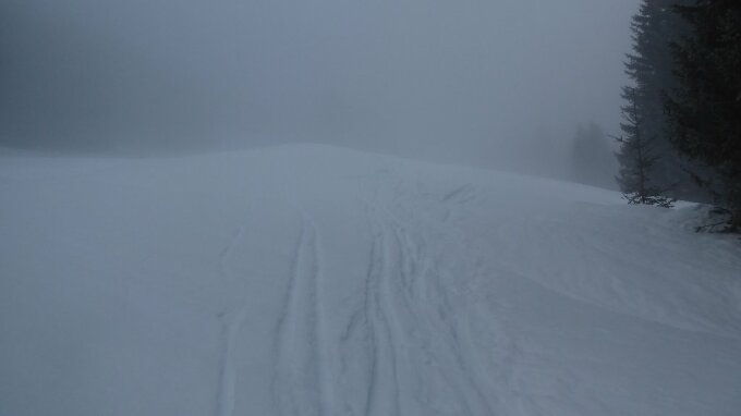 Start 9:30 erste halbe Std. totaler Blindflug auf altem Zustieg zur Birkachalpe hoch, Nebelgrenze zwischen 1200-1300m. Ab Birkach durch Wald Sicht gut danach grandioses Winterwetter auf guter Spur (z.T. etwas glatt) zum Gipfel. Abfahrt oben mäßig und zerfahren (Bruchharsch) dazwischen z.T.tragender Deckel. Locker vom Hocker geht zur Zeit nicht. Als 75j.Solist muß immer etwas defensiv, ökonomisch auf ankommen gefahren werden bei solchen Verhältissen. Dafür wurde er ab Rappengschwend mit frisch gewalzter Rodelbahn belohnt und schwingte vergnügt auf Feinripp ins Tal bis P.