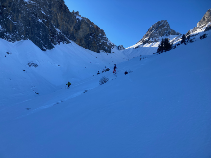 Im Aufstieg oft abgeblase Stellen. Abfahrt bis Tierfed-Gnüss. Für uns war der Gipfel 150m westlich des Kreuzes und 30m tiefer. Tolle Verhältnisse, Alpinerfahrung erforderlich. Nach Gnüss, 10 Minuten zu Fuss auf der Strasse, anschliessend Abfahrt bis Linthal. Bei Anreise mit öV Taxi Urnerboden Sprinter Vorreservieren.